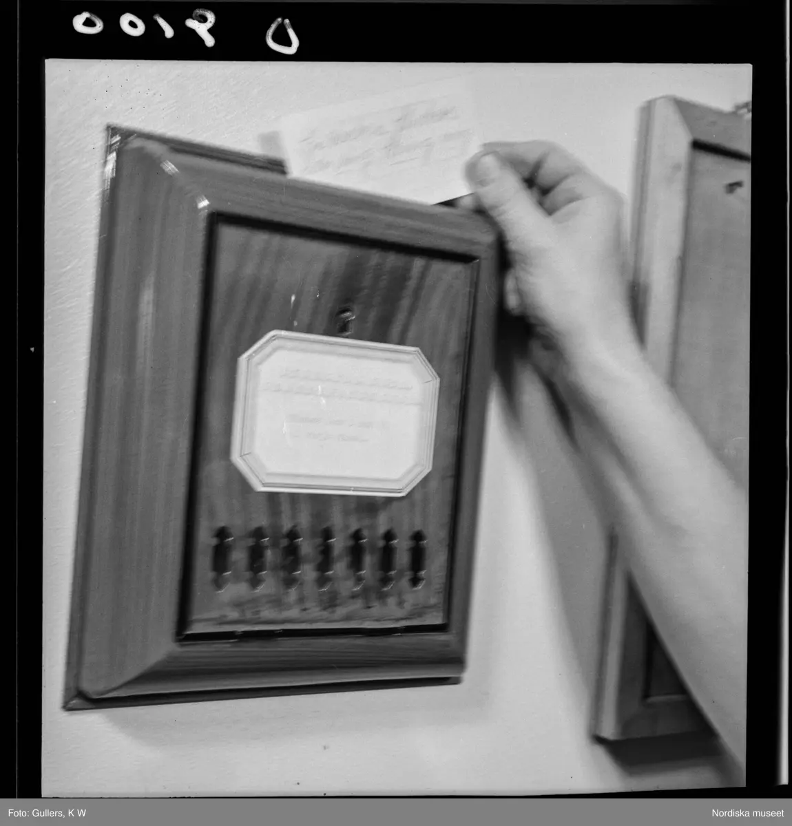 En låda uppsatt på en vägg för "Önskemål om grammofonskivor" i tekoindustrin på Borås Wäfveri.