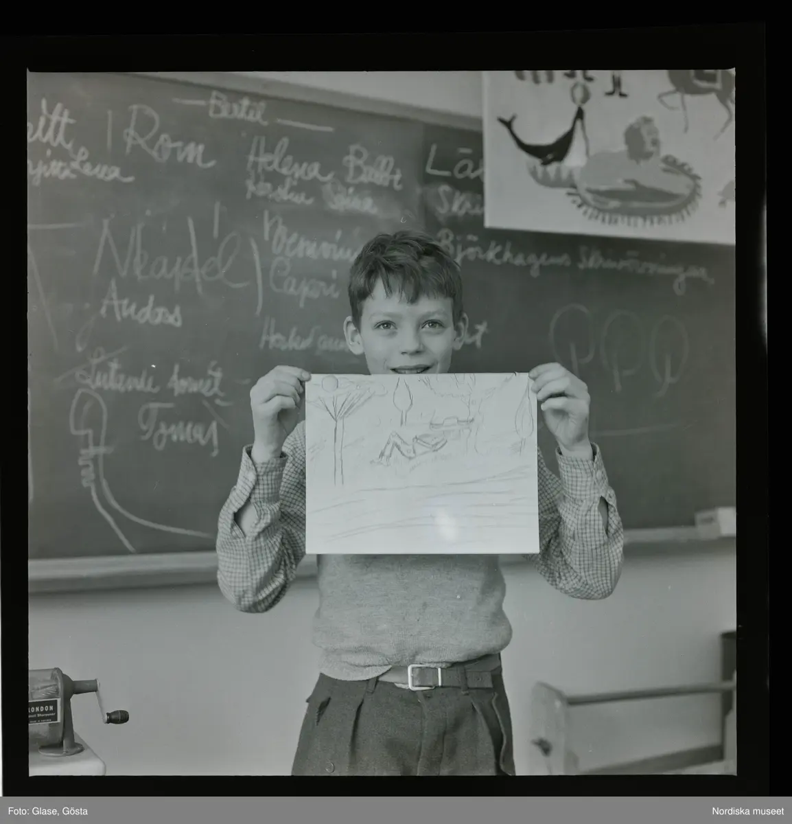 Elev visar upp en teckning, ståendes framför svarta tavlan i ett klassrum.