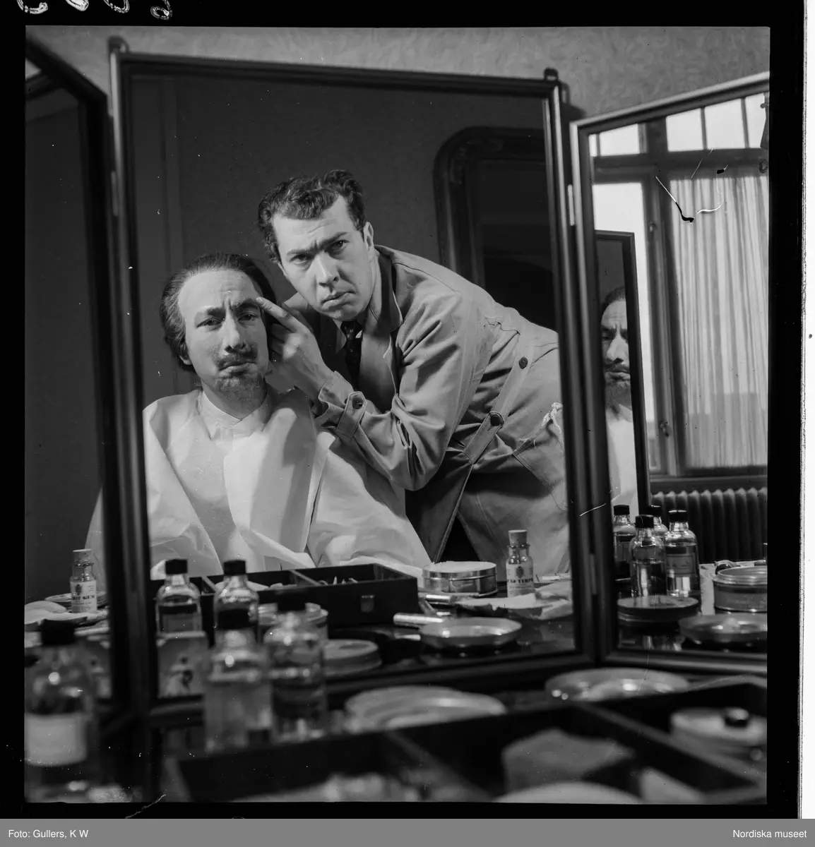 Skådespelaren Gunnar Sjöberg med kollega under föreberedelser framför spegeln i en sminkloge.