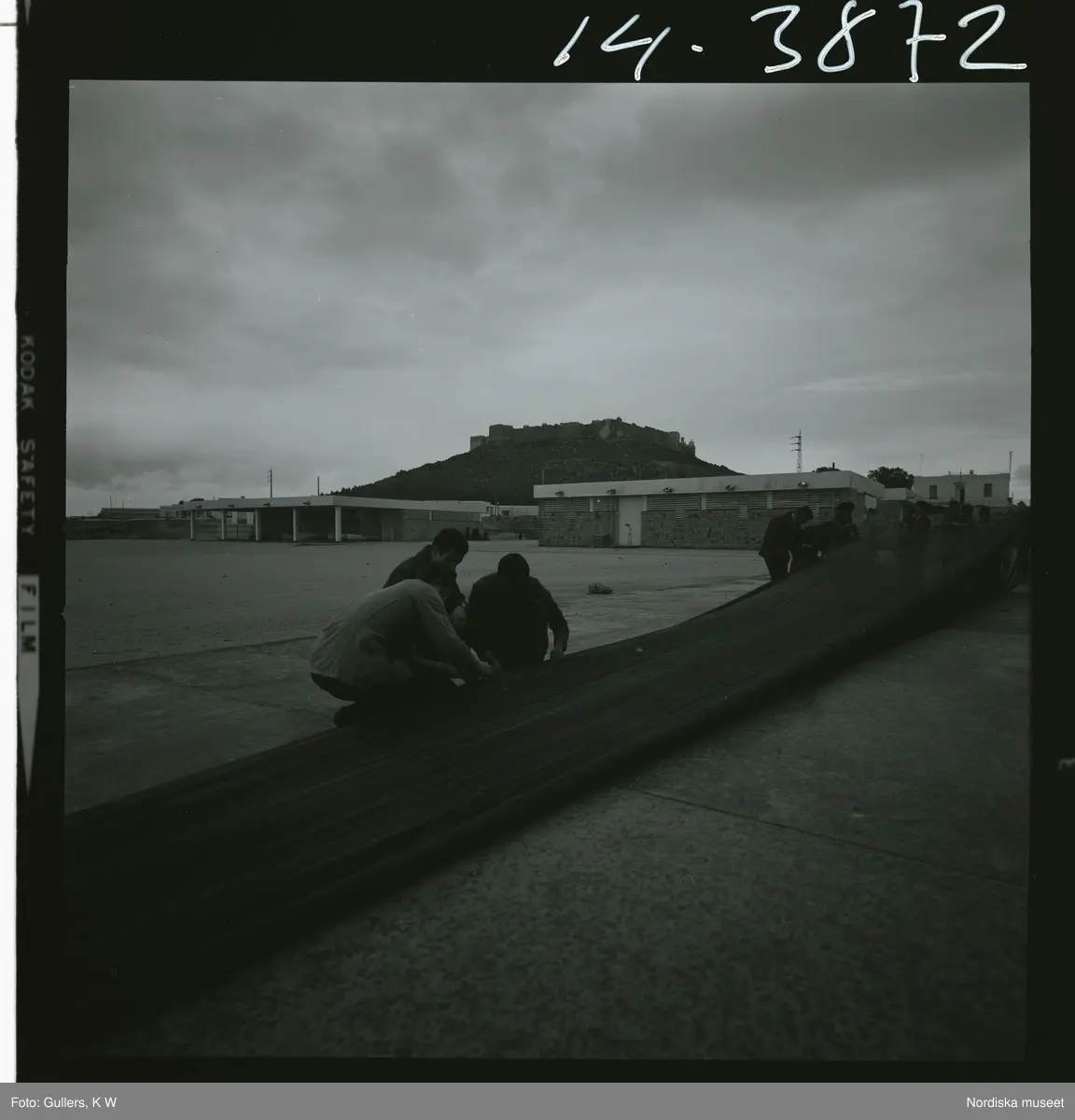 2791/1 Tunisien allmänt. En grupp män lagar ett långt fiskenät på ett torg.