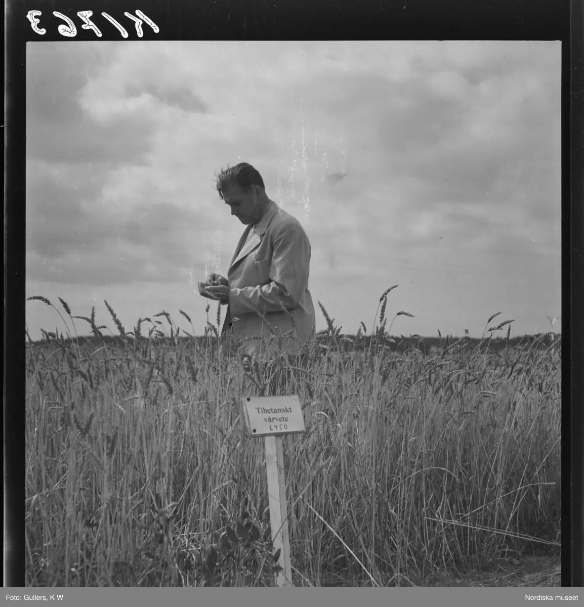 507 B Ultuna. En man inspekterar grödor på en åker med Tibetanskt vårvete.