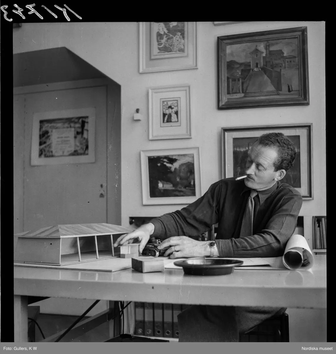 507 B Ultuna. En man sitter vid ett skrivbord i ett arbetsrum. På bordet en arkitekturmodell.