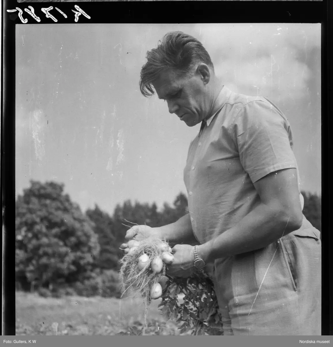 507 B Ultuna. En man inspekterar ett knippe potatis.