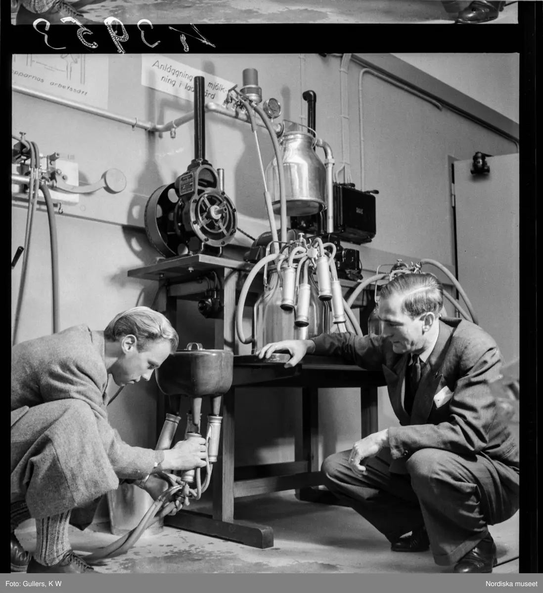 507 D Ultuna. En student hanterar en mjölkningsmaskin.