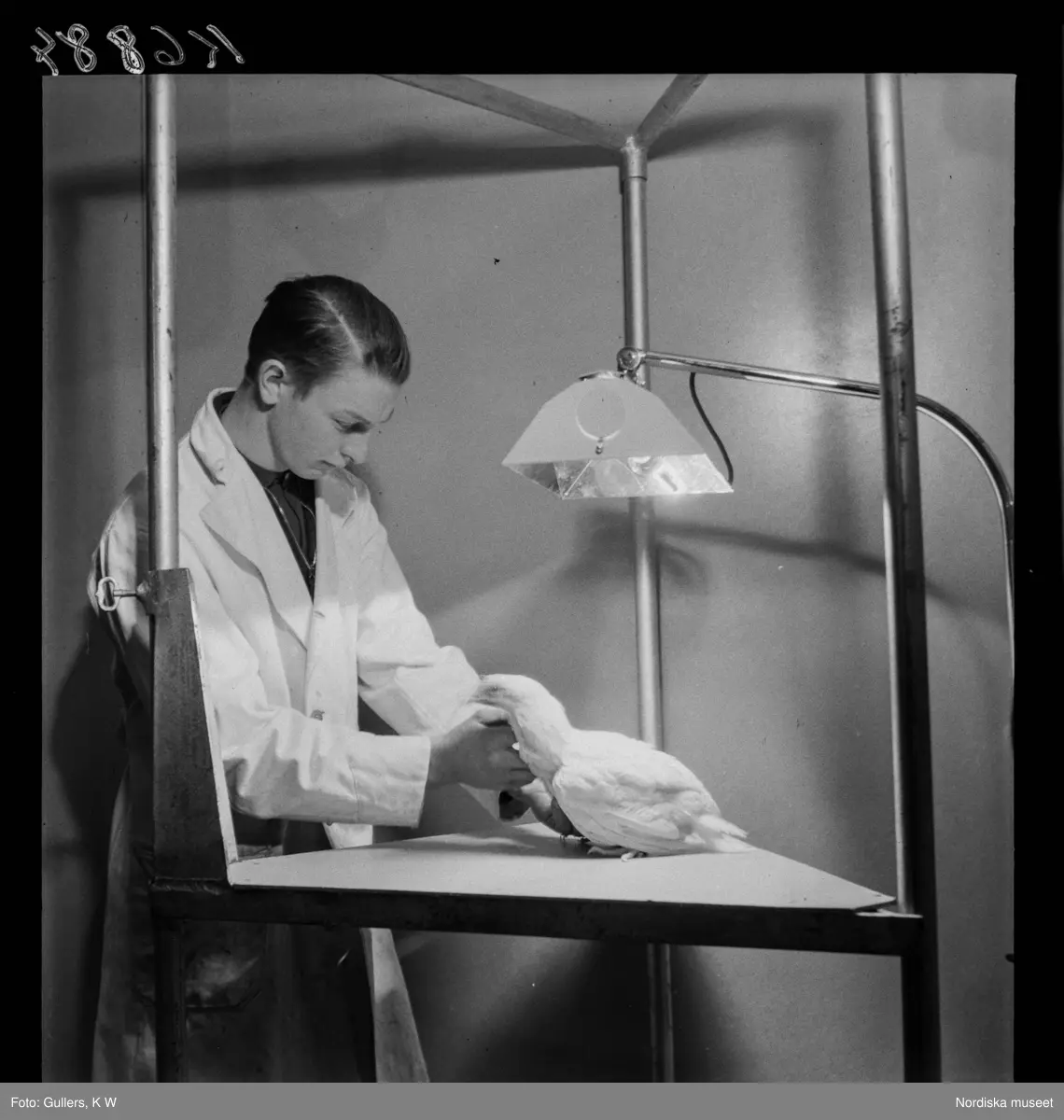 507 E Ultuna Fjäderfälaboratorium. En man arbetar med en höna.