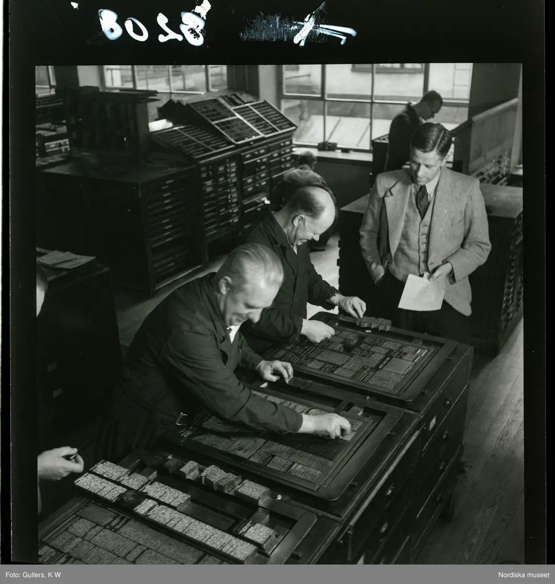 Journalist P. Wange med sättarna på Norrköpings tidningars tryckeri.