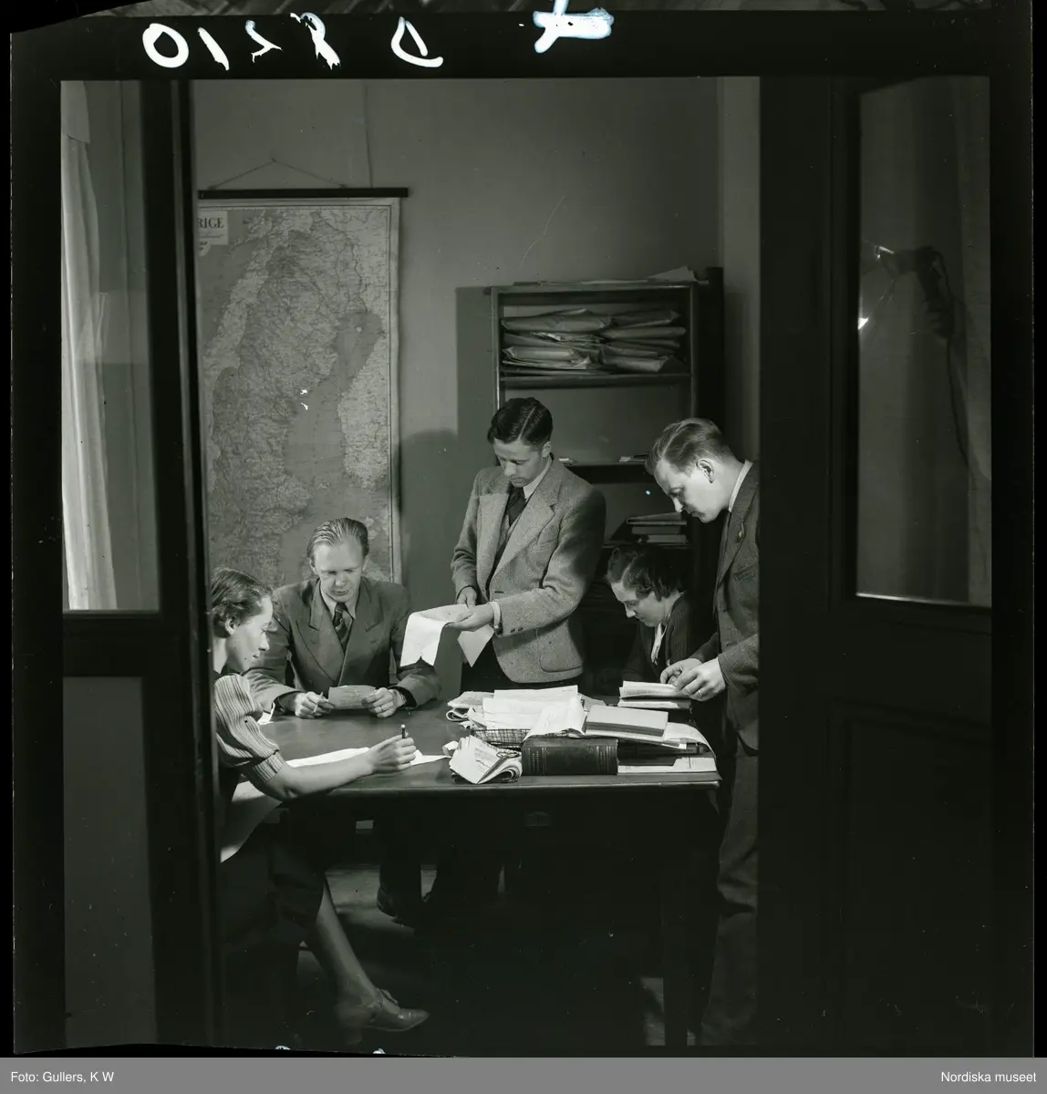 Journalist P. Wange i möte med kollegor i ett rum på Norrköpings tidningars redaktion.