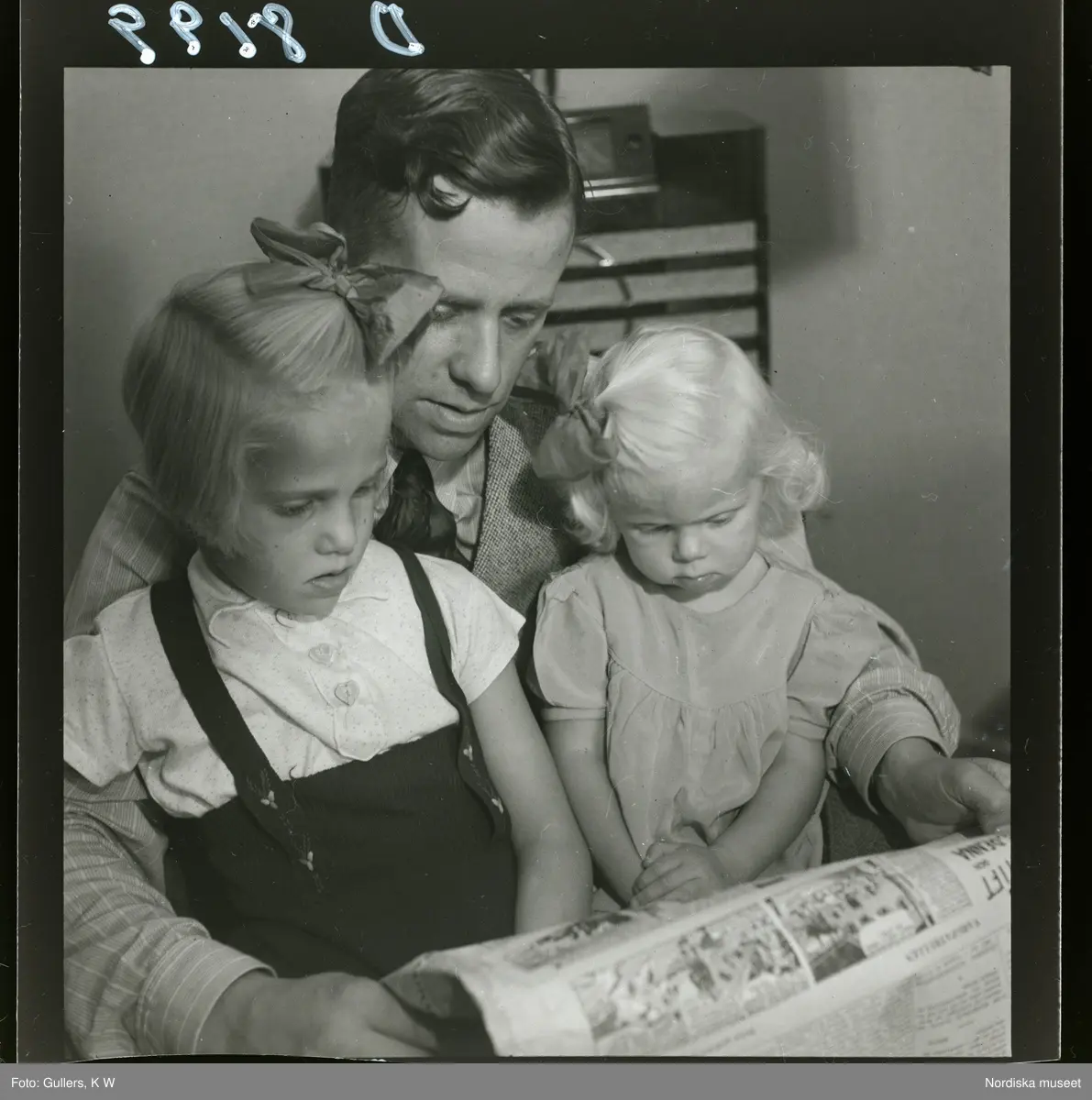 Journalist P. Wange läser tidningen tillsammans med sina två döttrar.