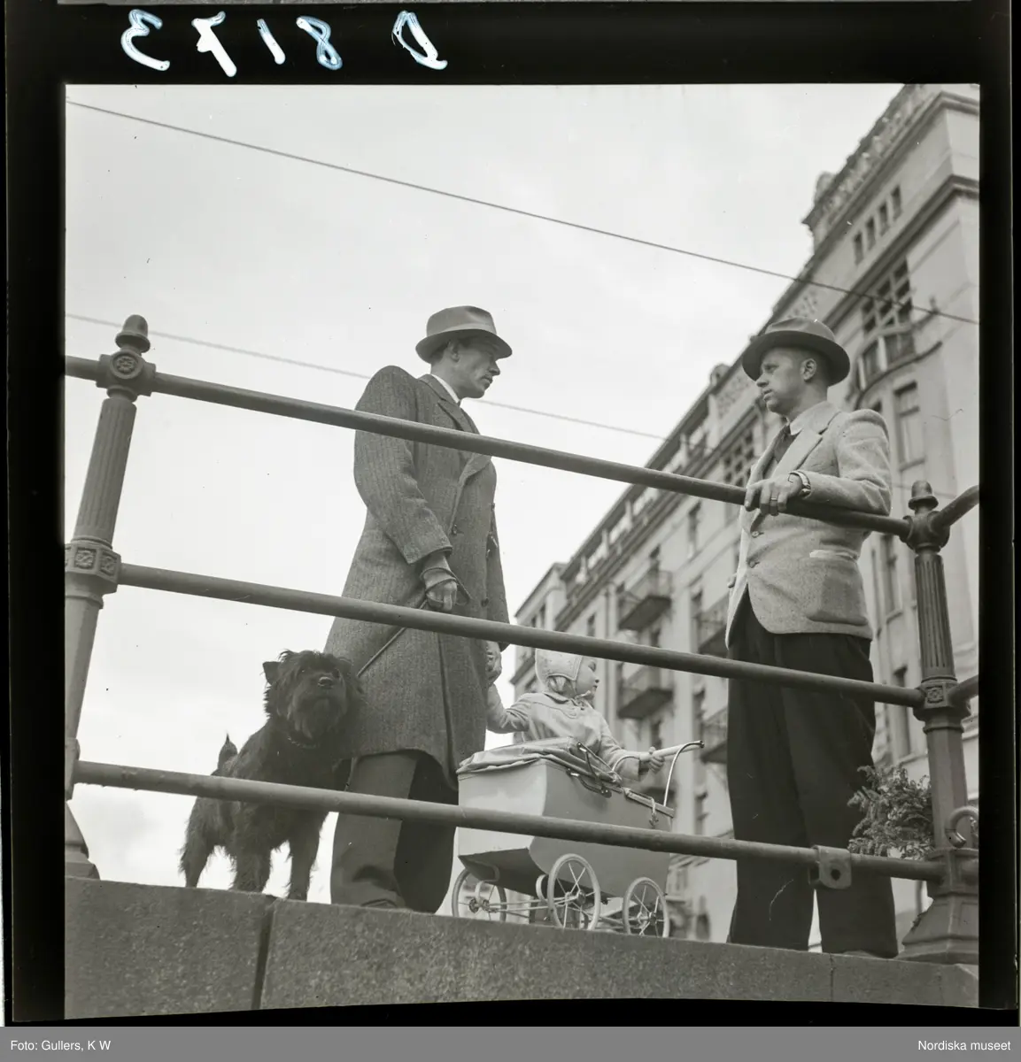 Ett par män samtalar ståendes ute på gata. Den ene med sitt barn i barnvagn och hund i koppel.