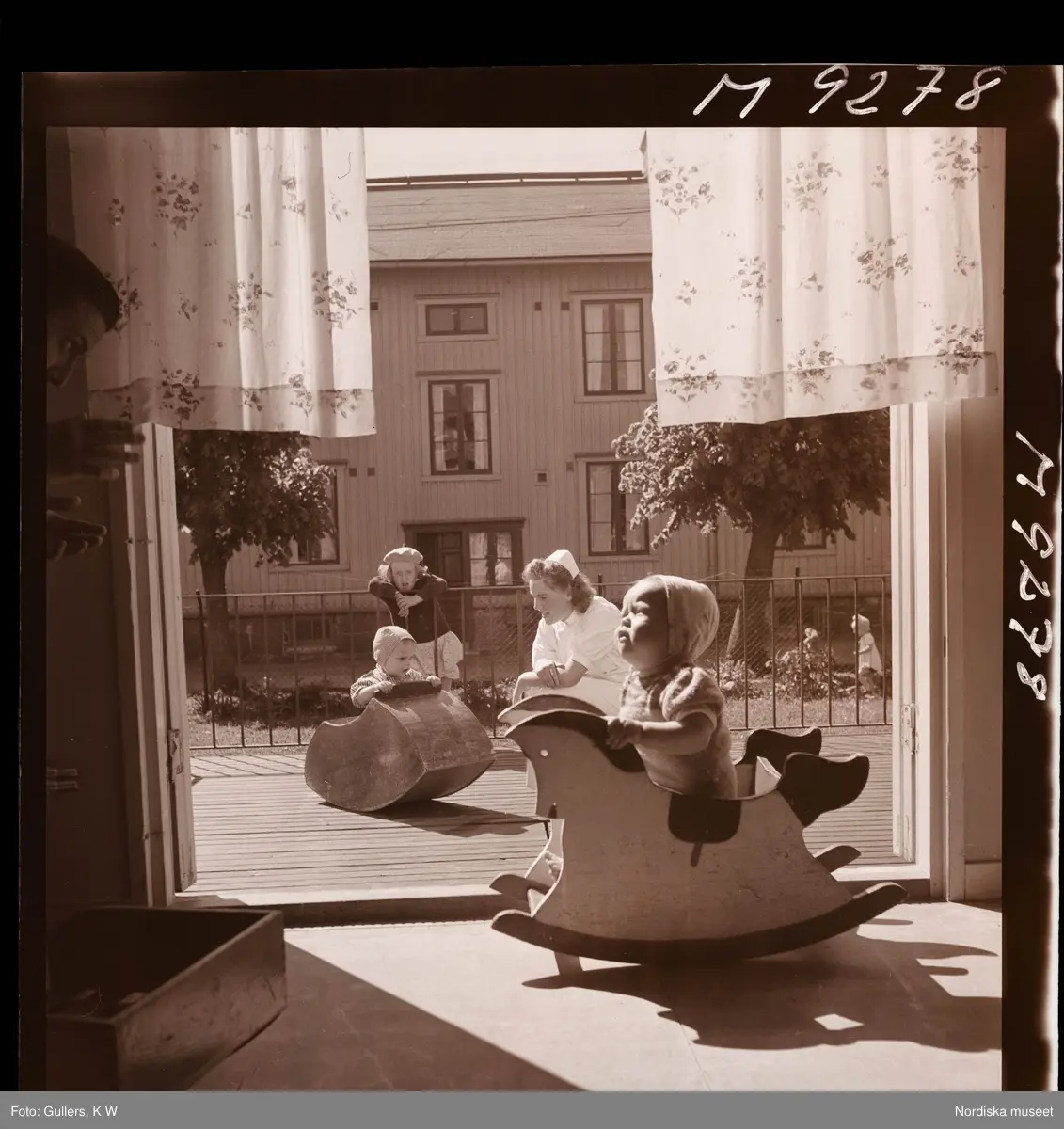 1708 G Mölnlycke väverier, Mölnlycke. En barnskötare leker med barn som gungar gunghäst.