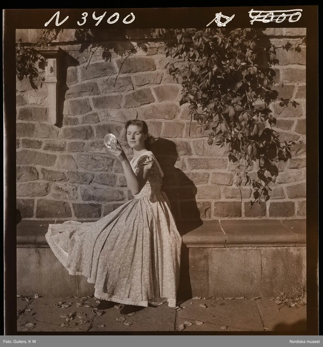 1708 N Mölnlycke väverier, mode; Stadshusträdgården, Stockholm; Mode för Mölnlycke. En modell i blommig klänning sitter på en mur och speglar sig i en fickspegel.
