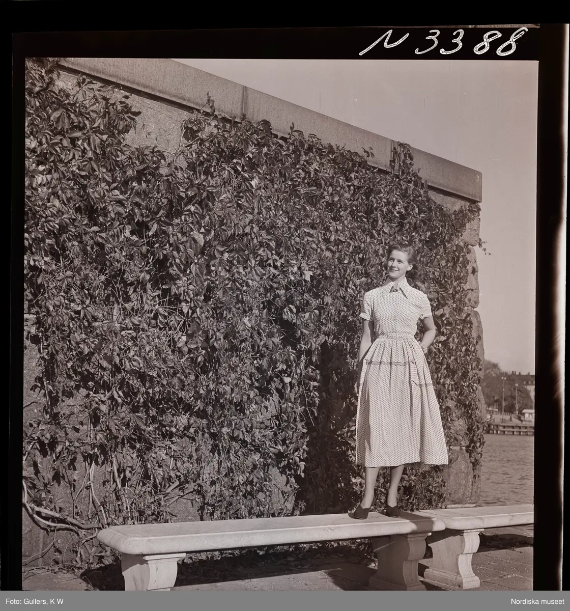 1708 N Mölnlycke väverier, mode; Stadshusträdgården, Stockholm; Mode för Mölnlycke. En modell i prickig klänning står på en stenbänk.