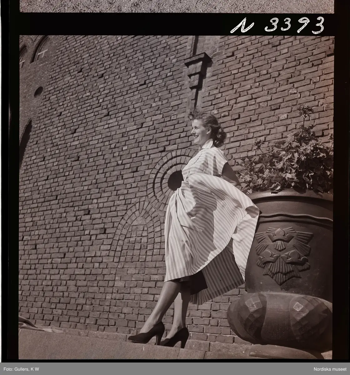 1708 N Mölnlycke väverier, mode; Stadshusträdgården, Stockholm; Mode för Mölnlycke. En modell i randig klänning står intill en stor urna framför en tegelfasad.