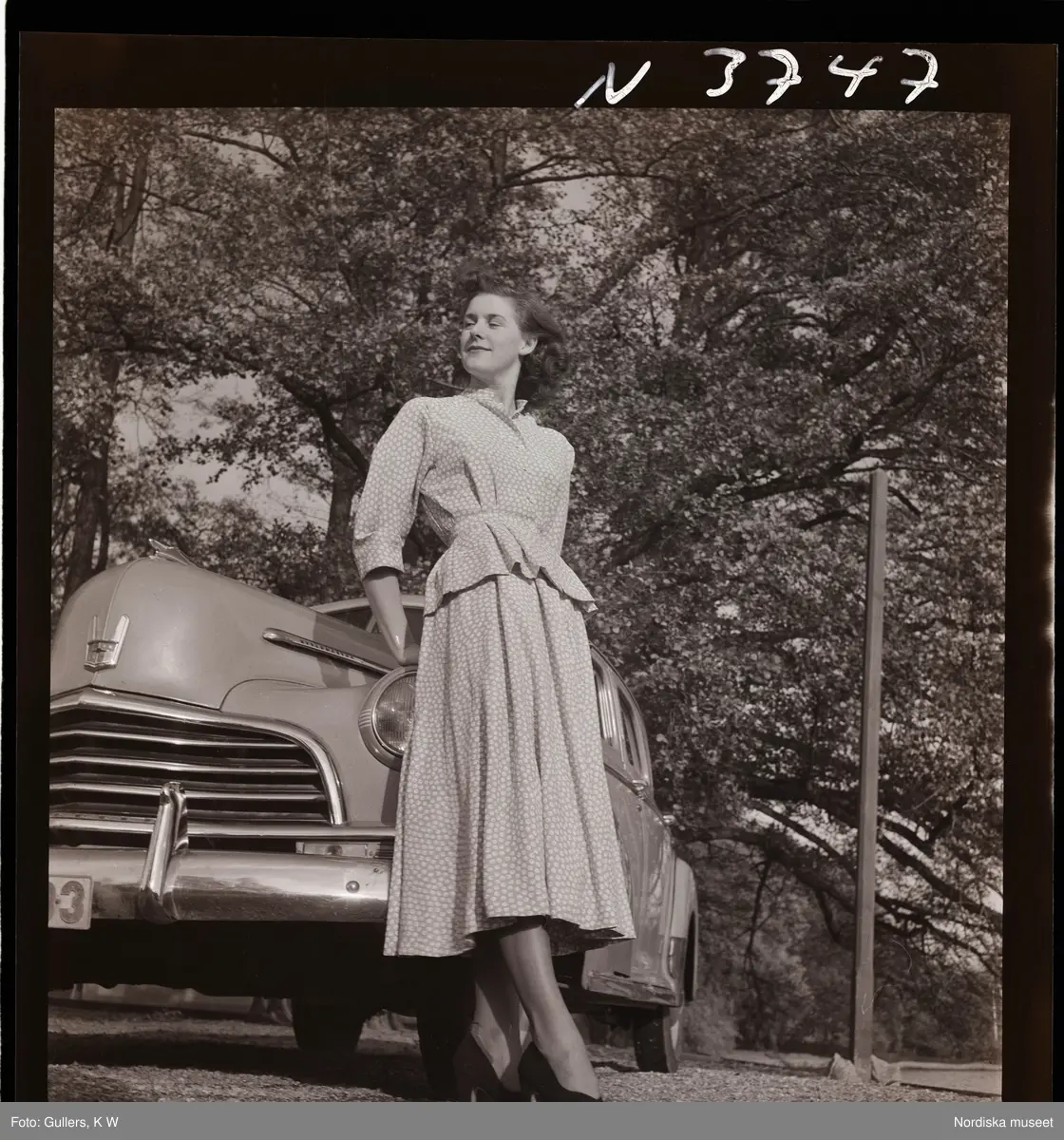 1708 N Mölnlycke väverier, mode; Stadshusträdgården, Stockholm; Mode för Mölnlycke. En modell i småmönstrad klänning poserar vid en bil.