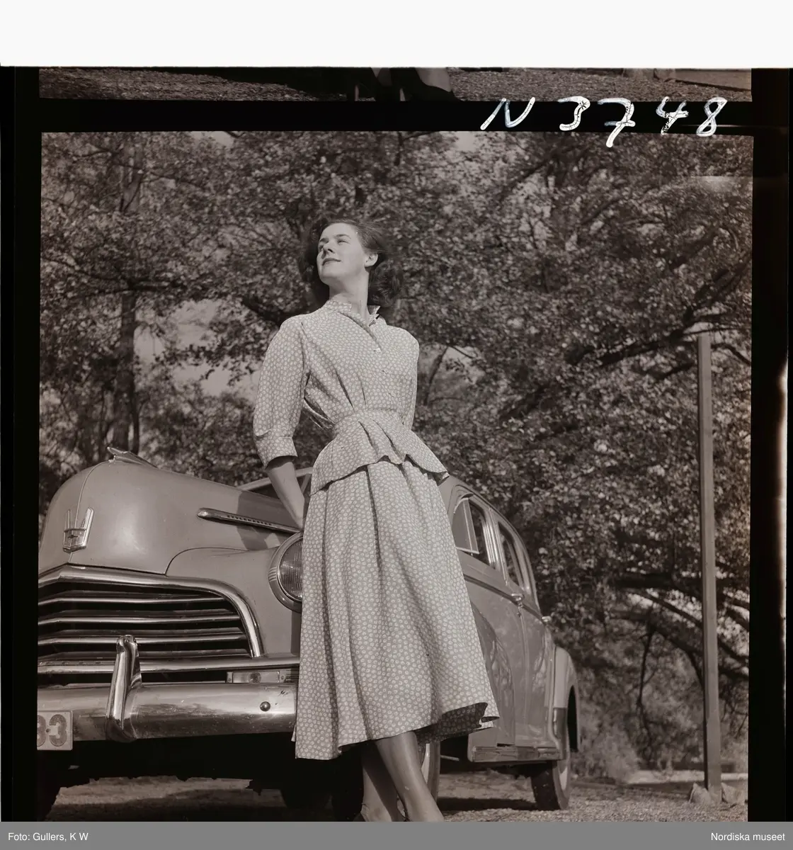 1708 N Mölnlycke väverier, mode; Stadshusträdgården, Stockholm; Mode för Mölnlycke. En modell i småmönstrad klänning poserar vid en bil.