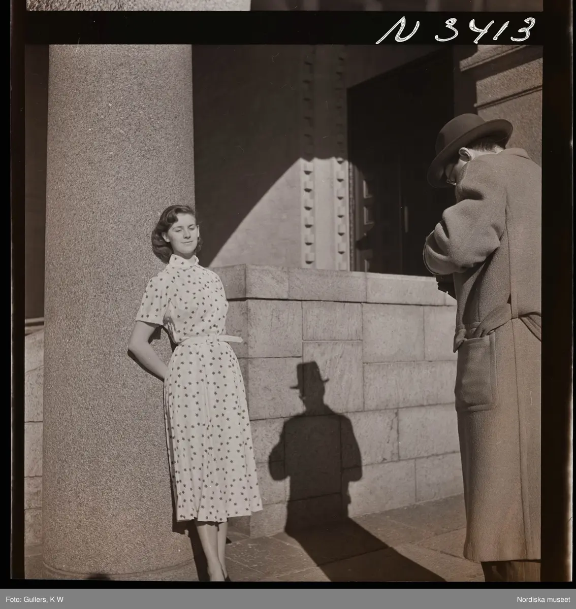 1708 N Mölnlycke väverier, mode; Stadshusträdgården, Stockholm; Mode för Mölnlycke. Modell i mönstrad klänning poserar för fotografen.