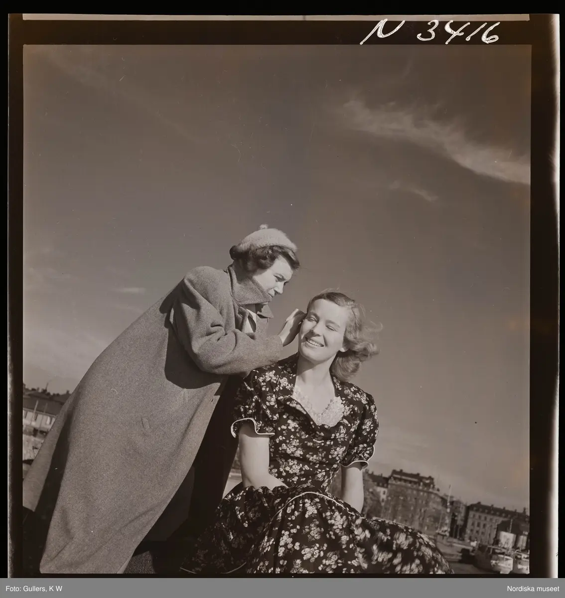1708 N Mölnlycke väverier, mode; Stadshusträdgården, Stockholm; Mode för Mölnlycke. En kvinna rättar till modellens frisyr.
