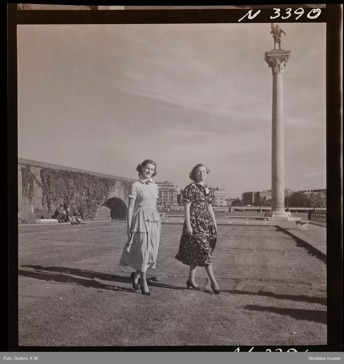1708 N Mölnlycke väverier, mode; Stadshusträdgården, Stockholm; Mode för Mölnlycke. Två modeller framför Stockholms stadshus. Engelbrektsstatyn i bakgrunden.