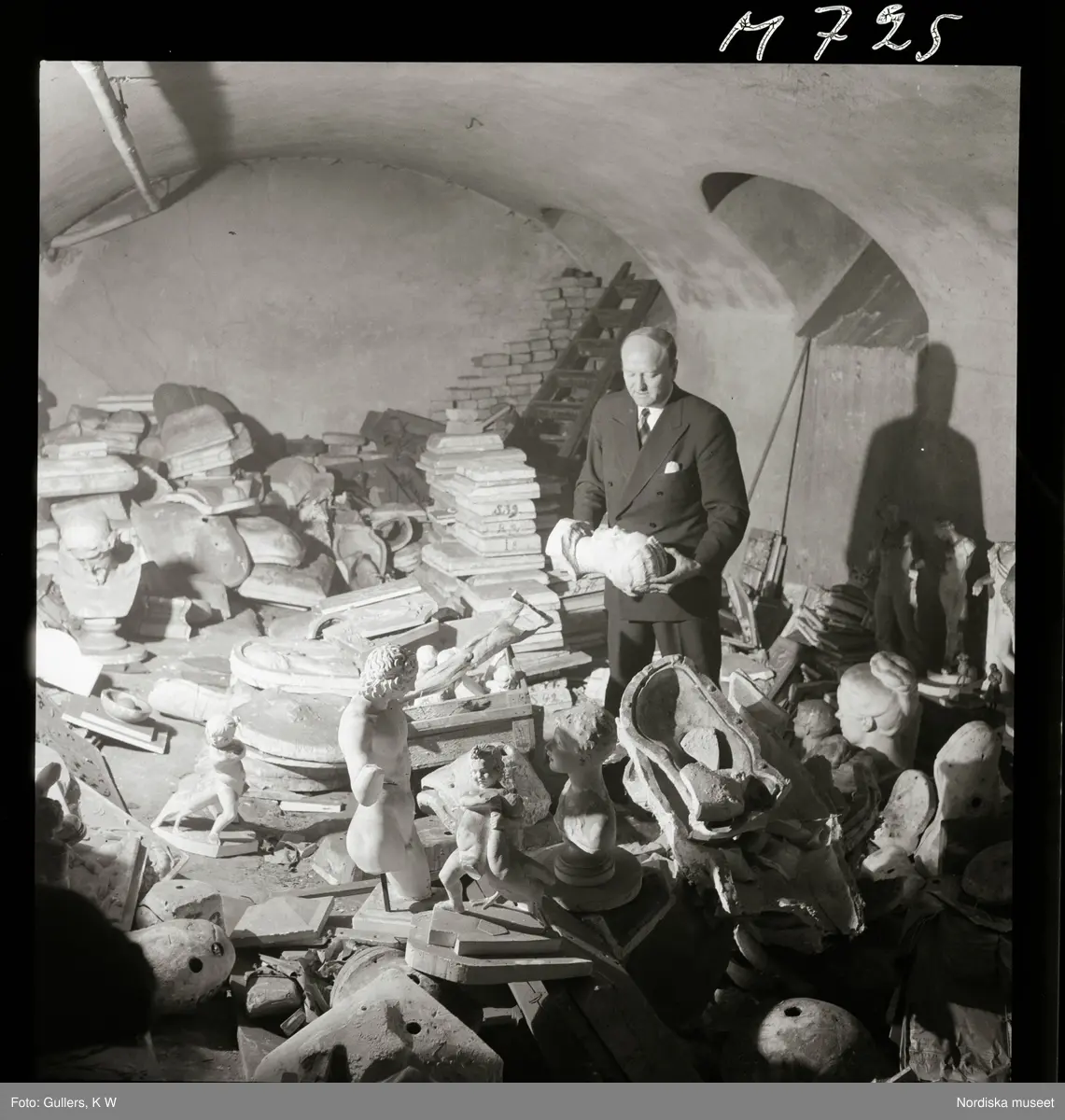 1677 Konstfackskolan. En man i kostym står och håller i ett gipshuvud i en källare fylld av skulpturer och reliefer. Eventuellt Åke Stavenow, rektor åren 1946-1964.