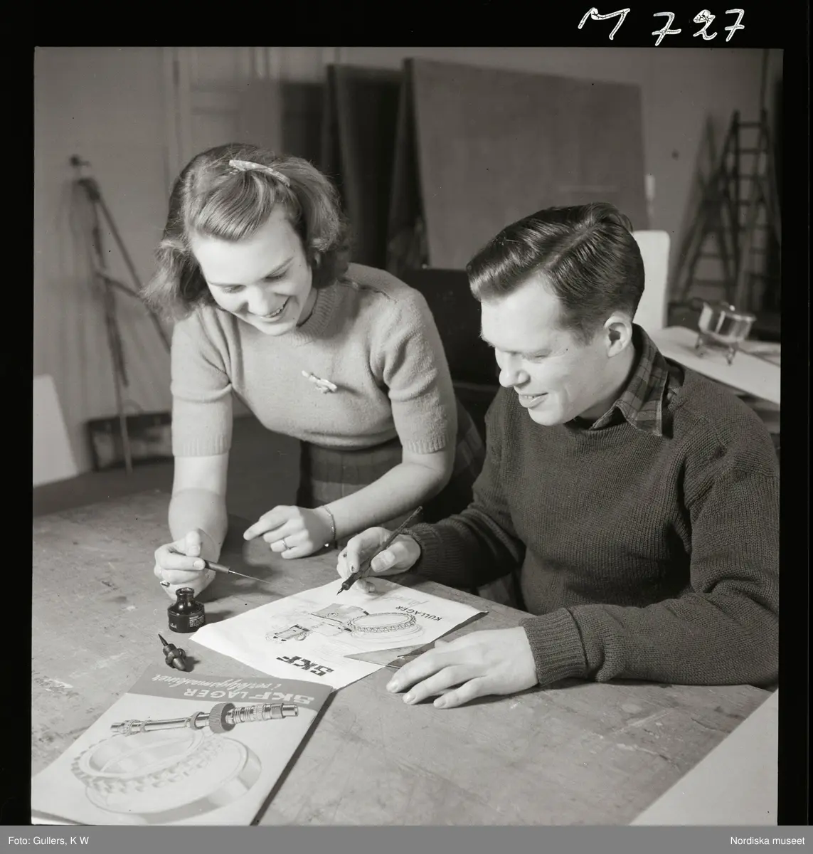 1677 Konstfackskolan. Ett par elever vid ett bord, tecknar material från SKF kullager.