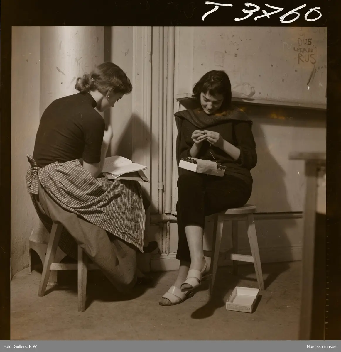 1677 B Konstfackskolan (tösen Boheman). Två kvinnliga elever sitter på varsin pall. Den ena läser, den andra handarbetar.