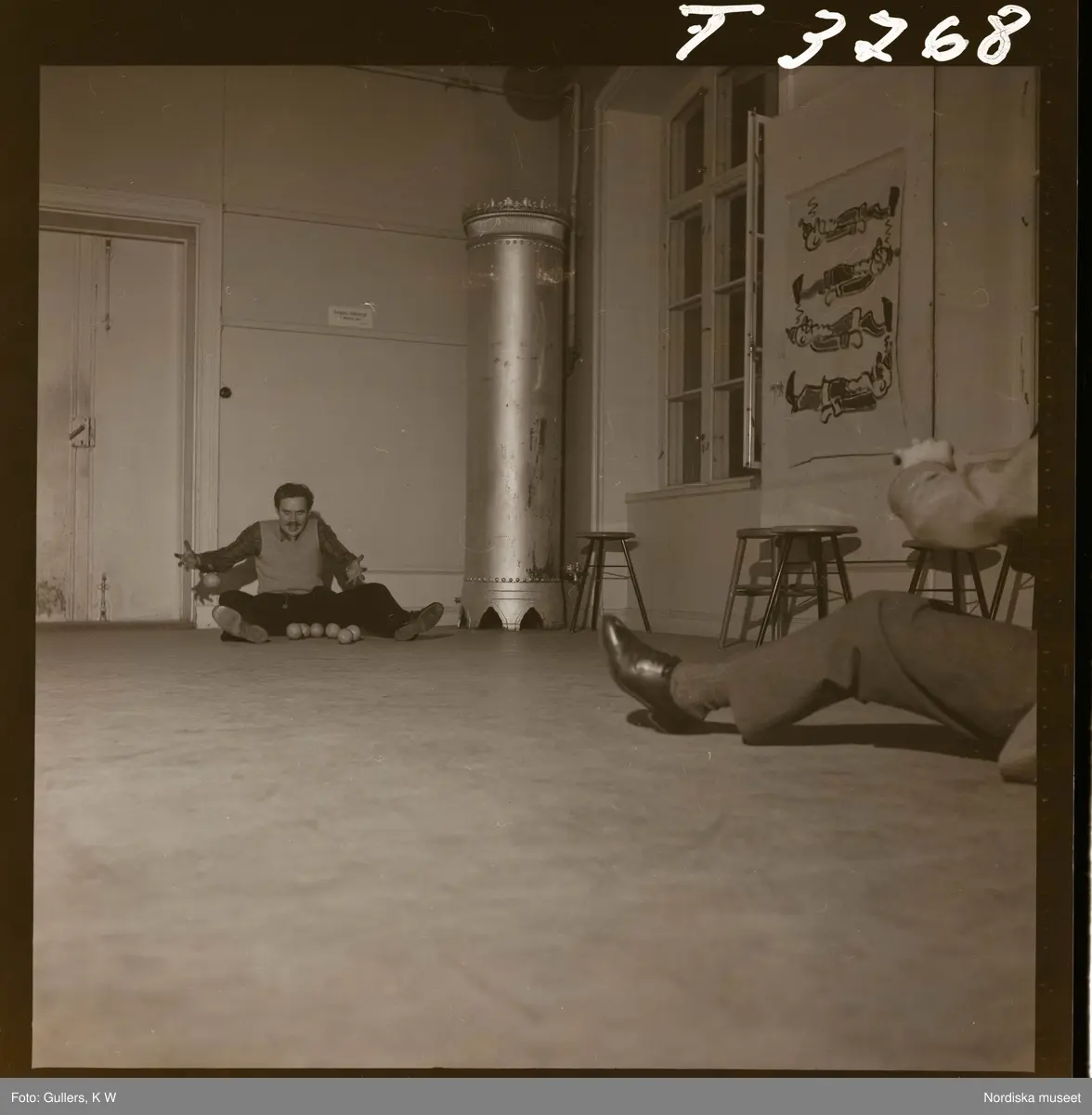 1677 B Konstfackskolan (tösen Boheman). . Lek och spel i ateljén. Två manliga elever sitter på golvet och rullar bollar emellan sig.