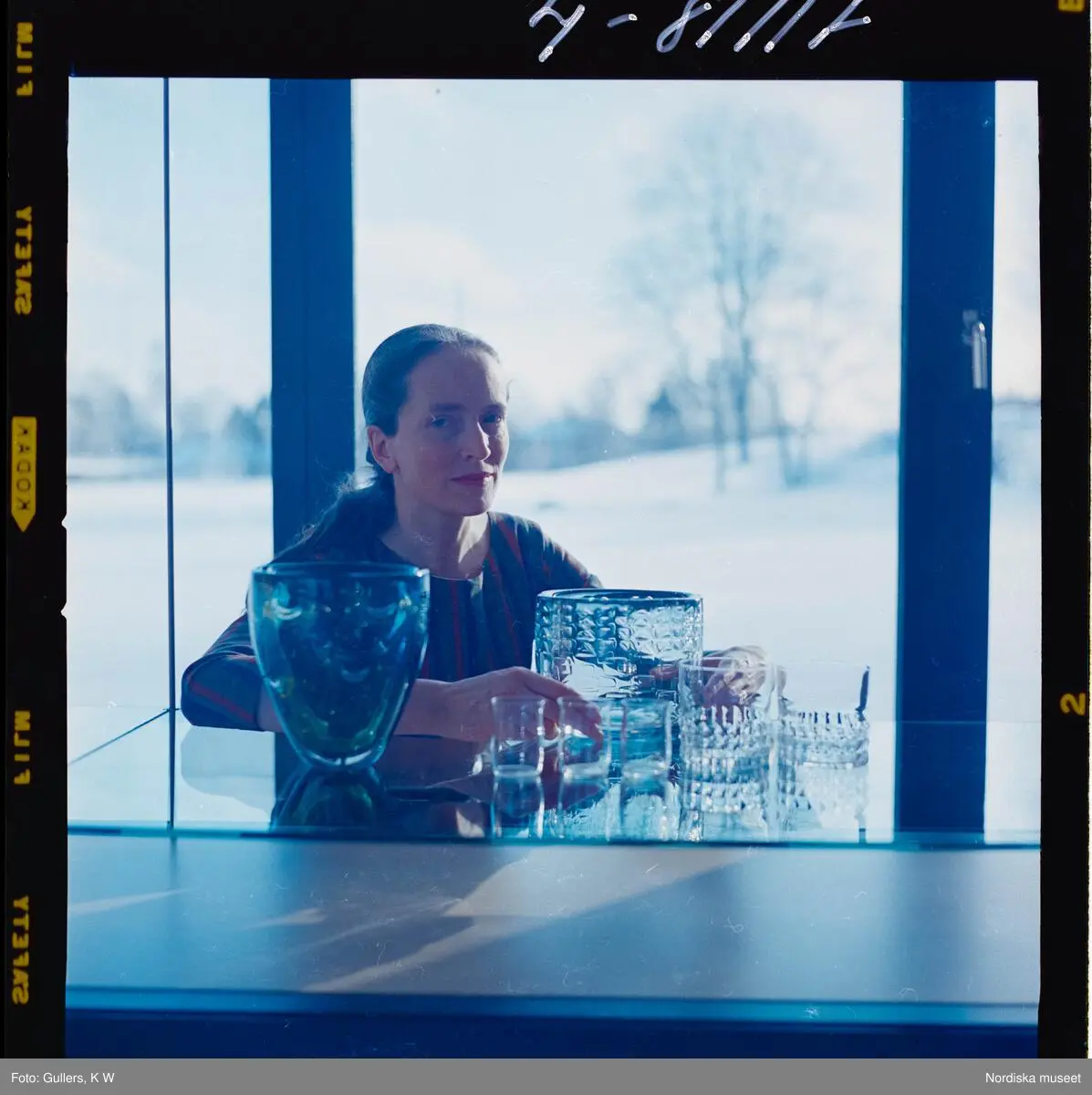 1713 Orrefors Glasbruk Ingeborg Lundin. Porträtt med formgivna glasföremål.
