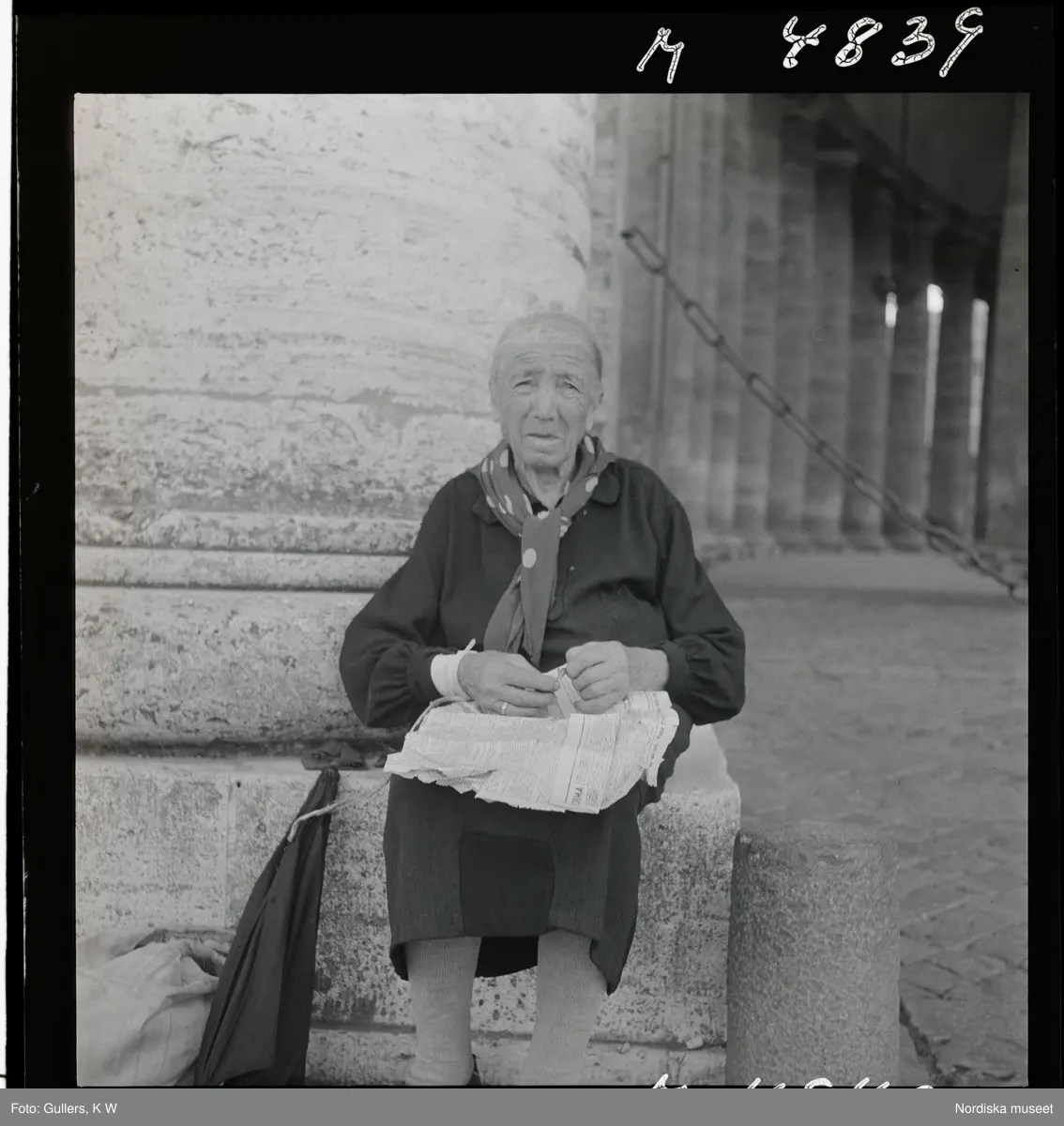 1717/A Rom. Porträtt av en äldre kvinna, sittandes i kolonnaden, Petersplatsen, Vatikanstaten.