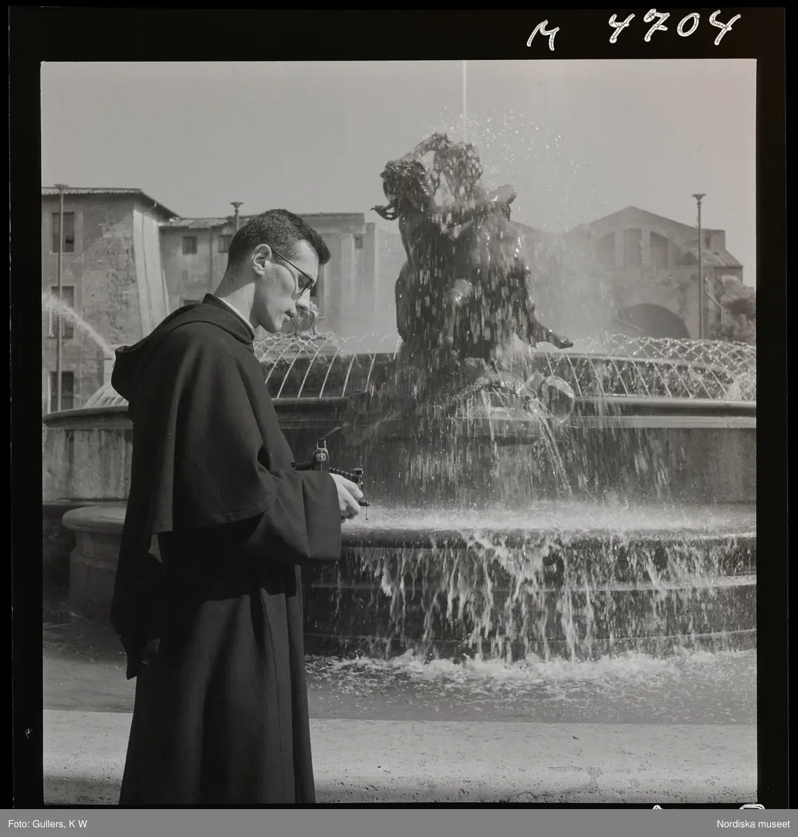 1717/B Rom. En präst fotograferar framför en fontän.