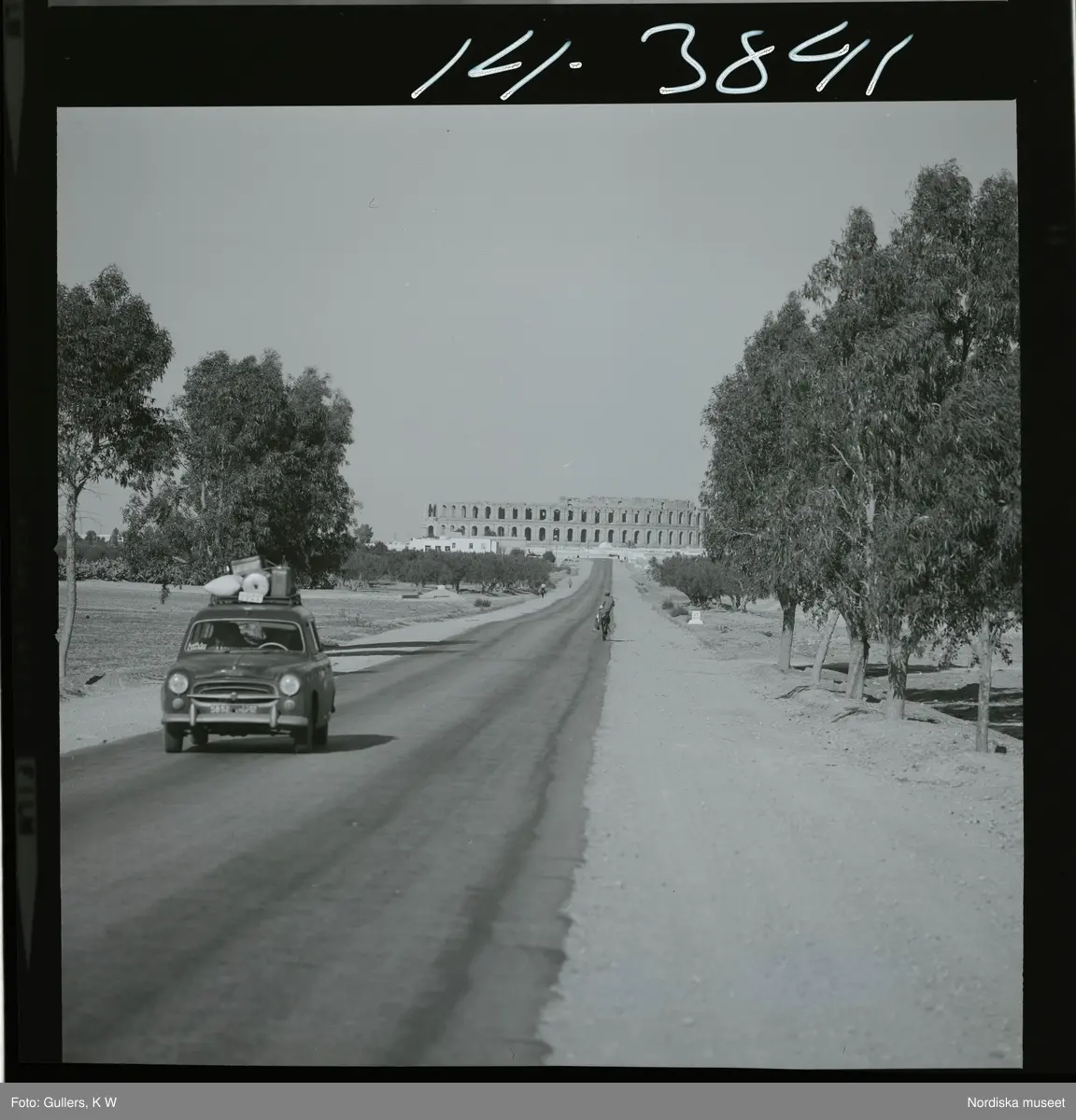 2791/1 Tunisien allmänt. Väg till romerska amfiteatern i El Djem. En bil transporterar väskor på taket, en man rider på åsna.