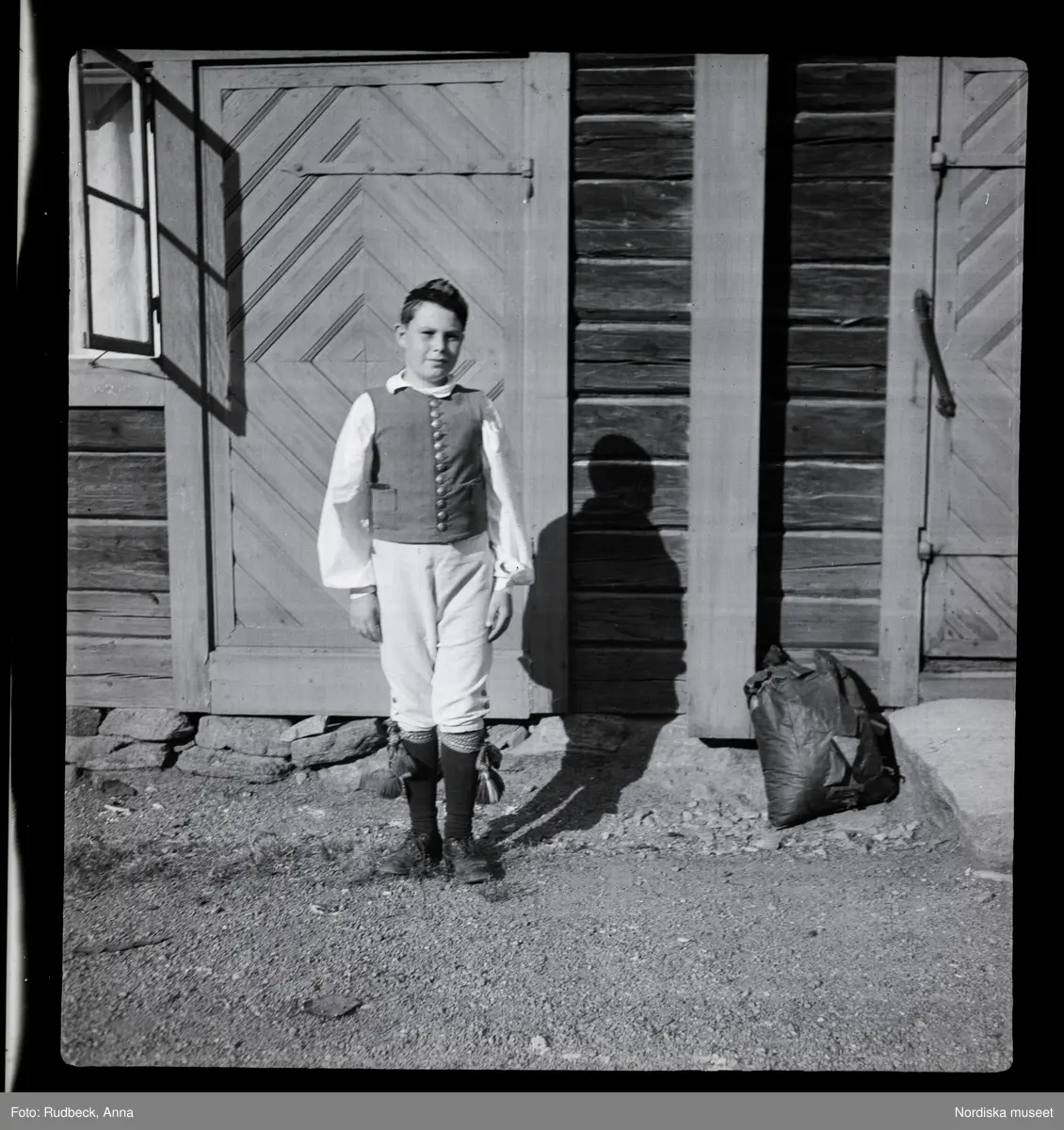 130 Skansen Ringleksbarn. En pojke i folkdräkt, utomhus på Skansen.