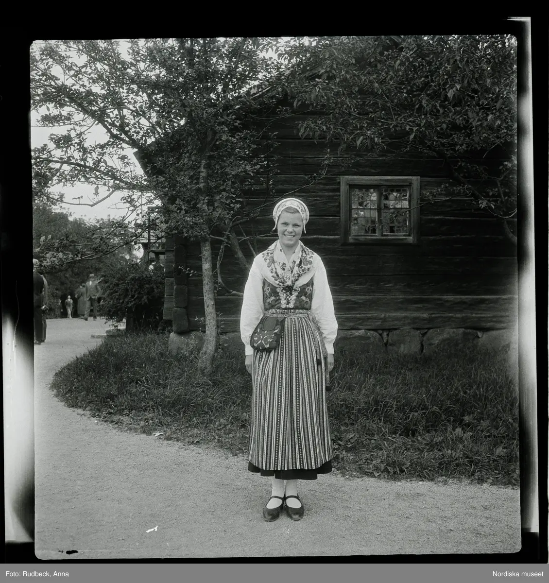 Skansen Ringleksbarn. En ung kvinna i folkdräkt, utomhus på Skansen.