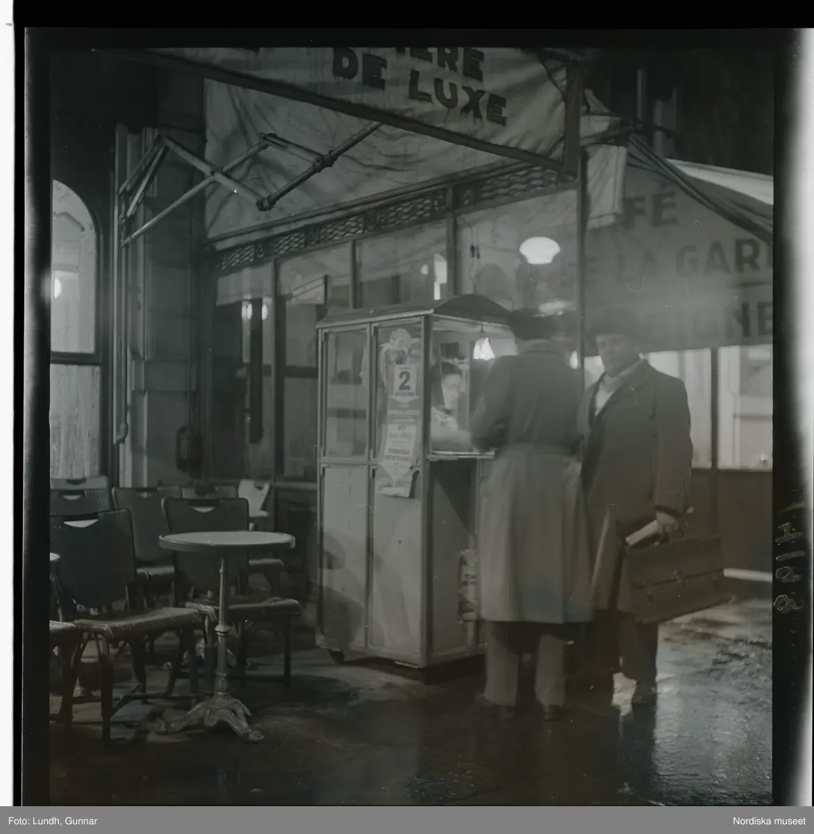2 december 1950. Paris. Två män vid ett litet stånd utanför ett café, kvällsbild.