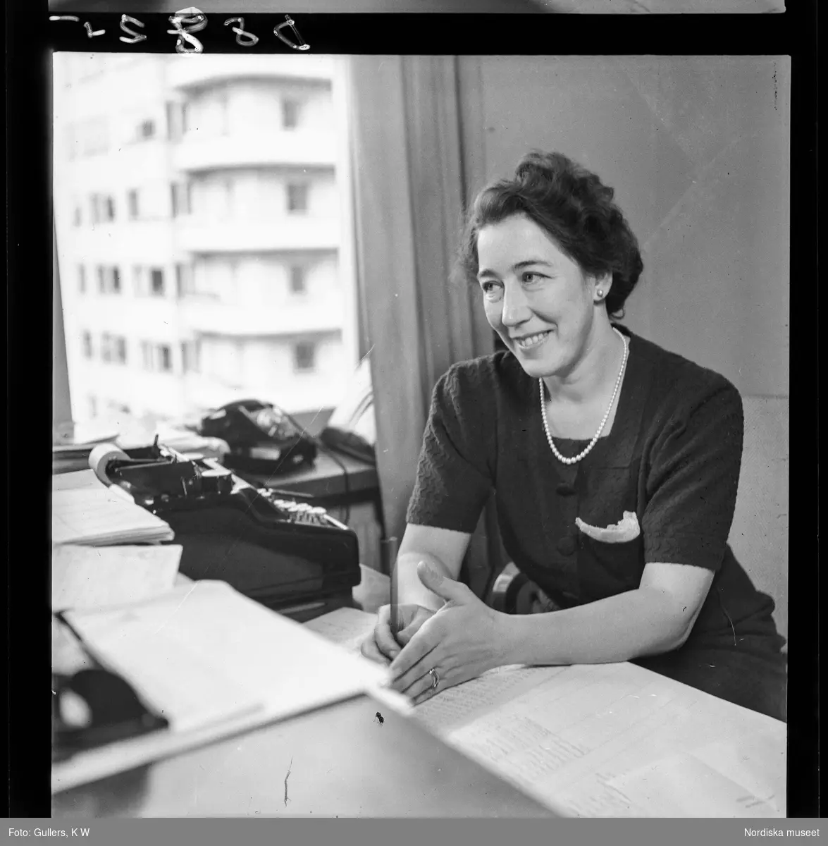 534 Polisskolan. En kvinna sittandes vid ett skrivbord fullt av papper och en räknemaskin.