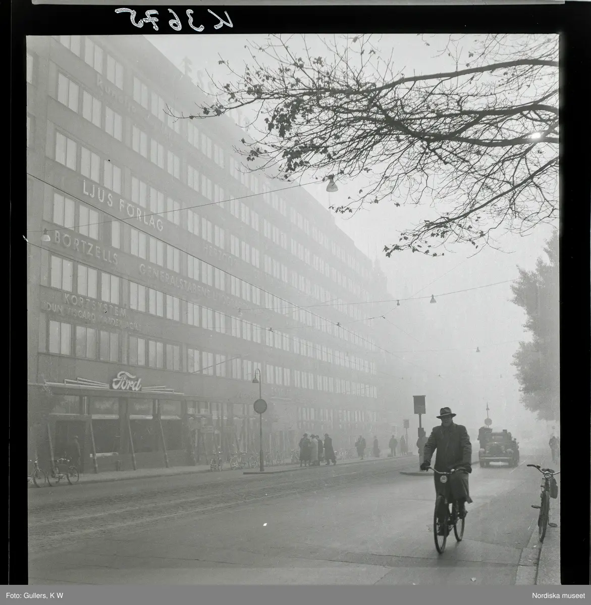 542/B Dimma. Trafik på gata framför byggnad som skyltar för Esselte, Ljus förlag och Ford.