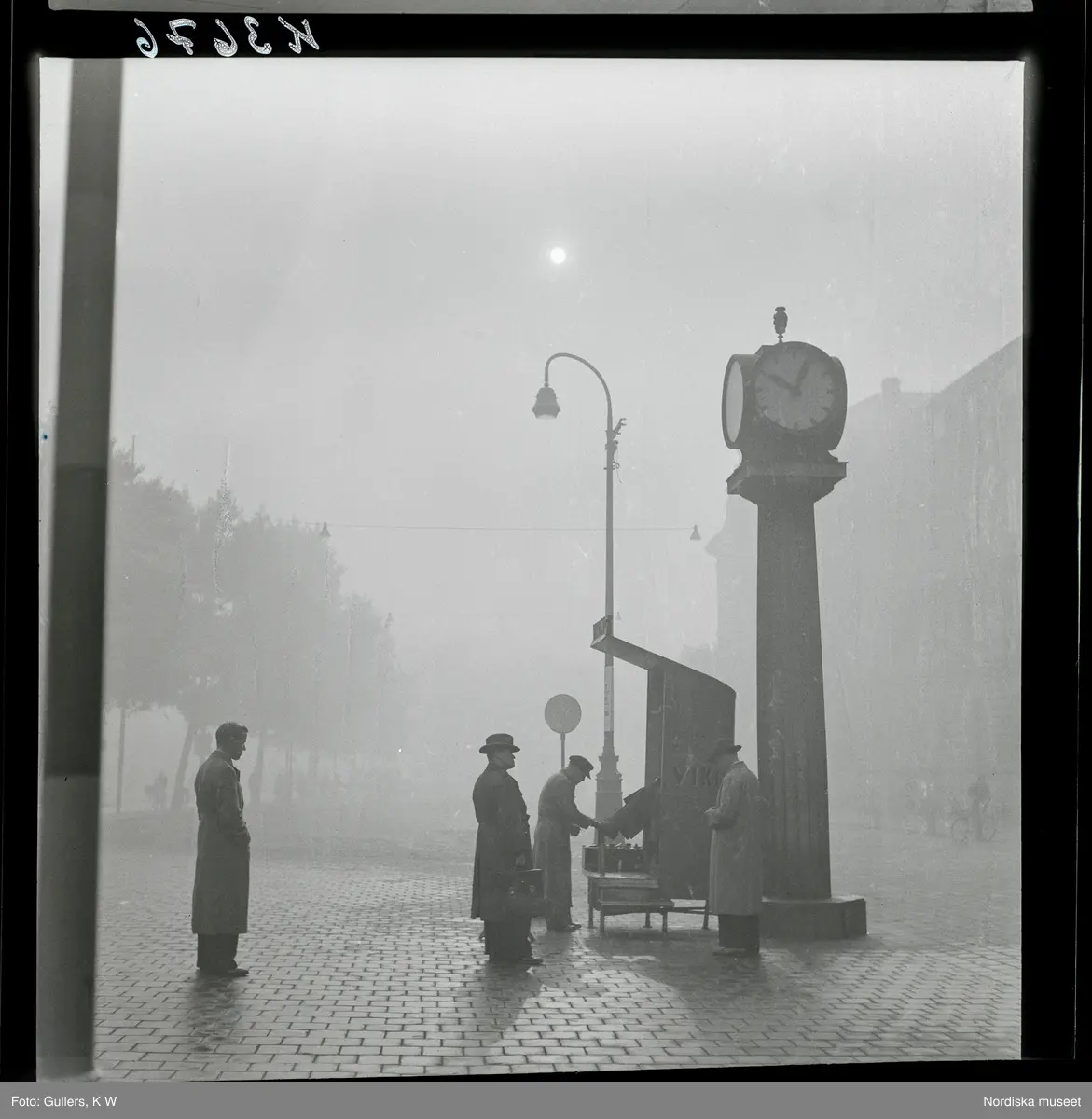 542/B Dimma. Män som väntar på ett torg. Där finns en skoputsare och en klockstapel.