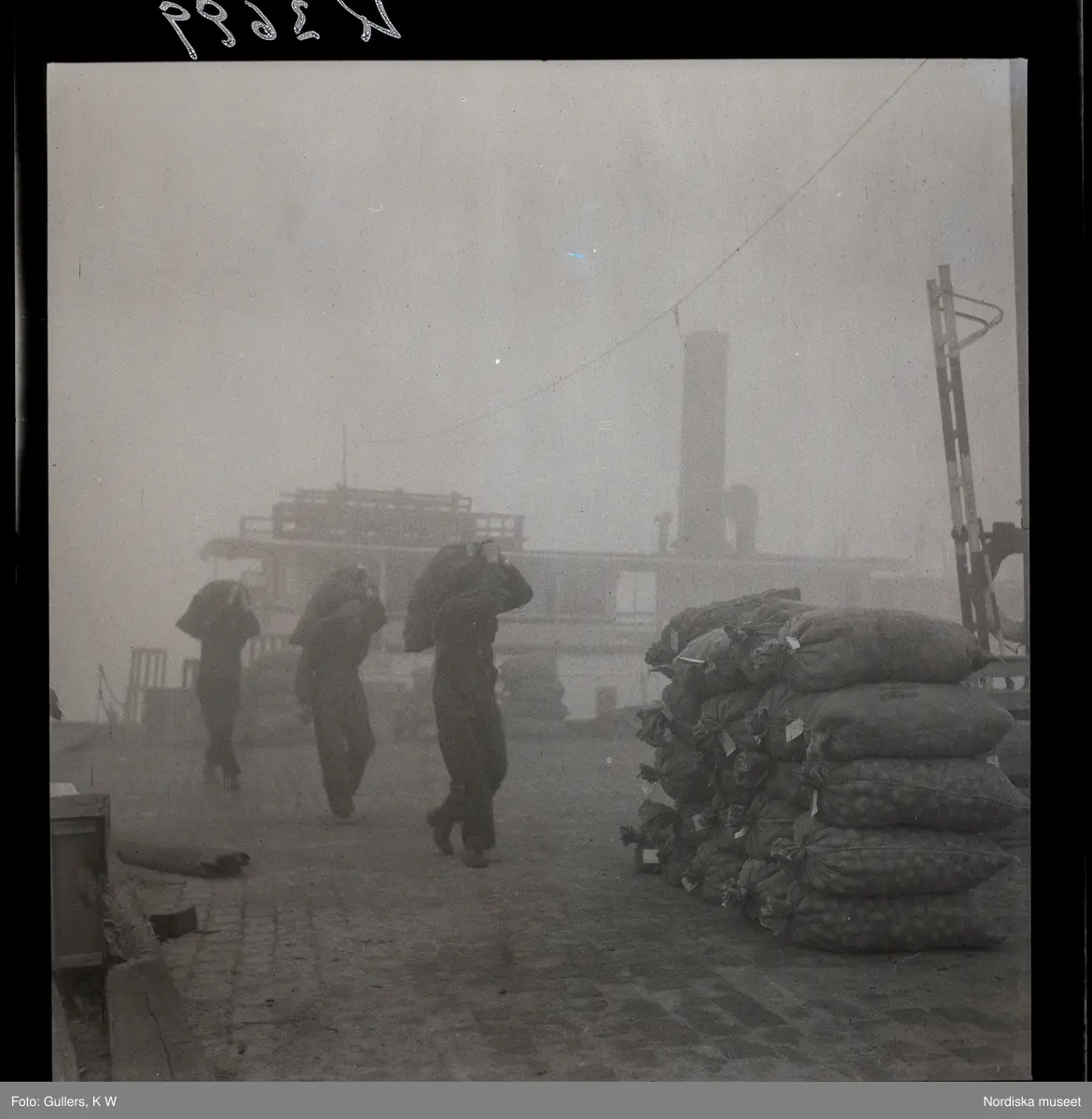 542/B Dimma. Lossning av (potatis?)säckar vid kaj.