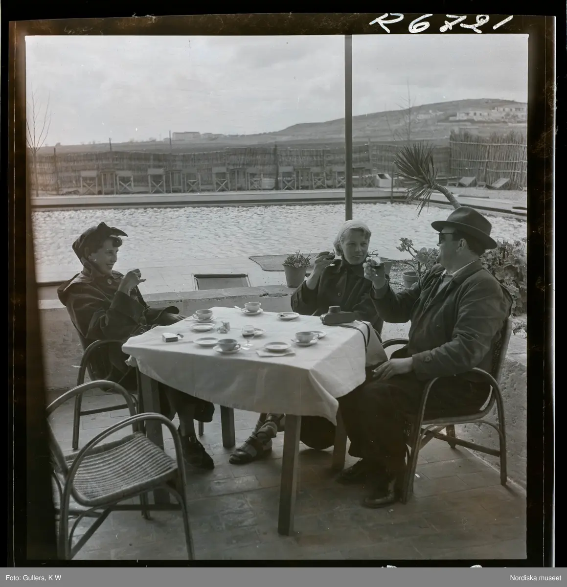 568 F. Stieg Trenter, Torremolinos. Stieg Trenter och två kvinnor sittter och skålar vid ett bord intill en pool.