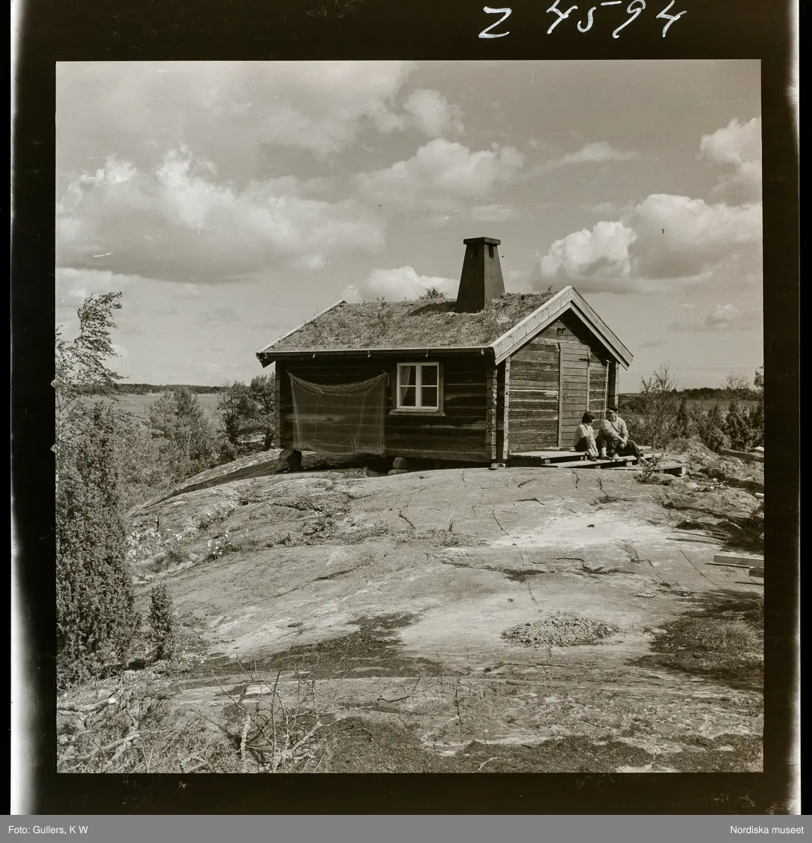 Ön Lilla Brudholmen. Två personer sitter på trappen till en stuga på en klippa.