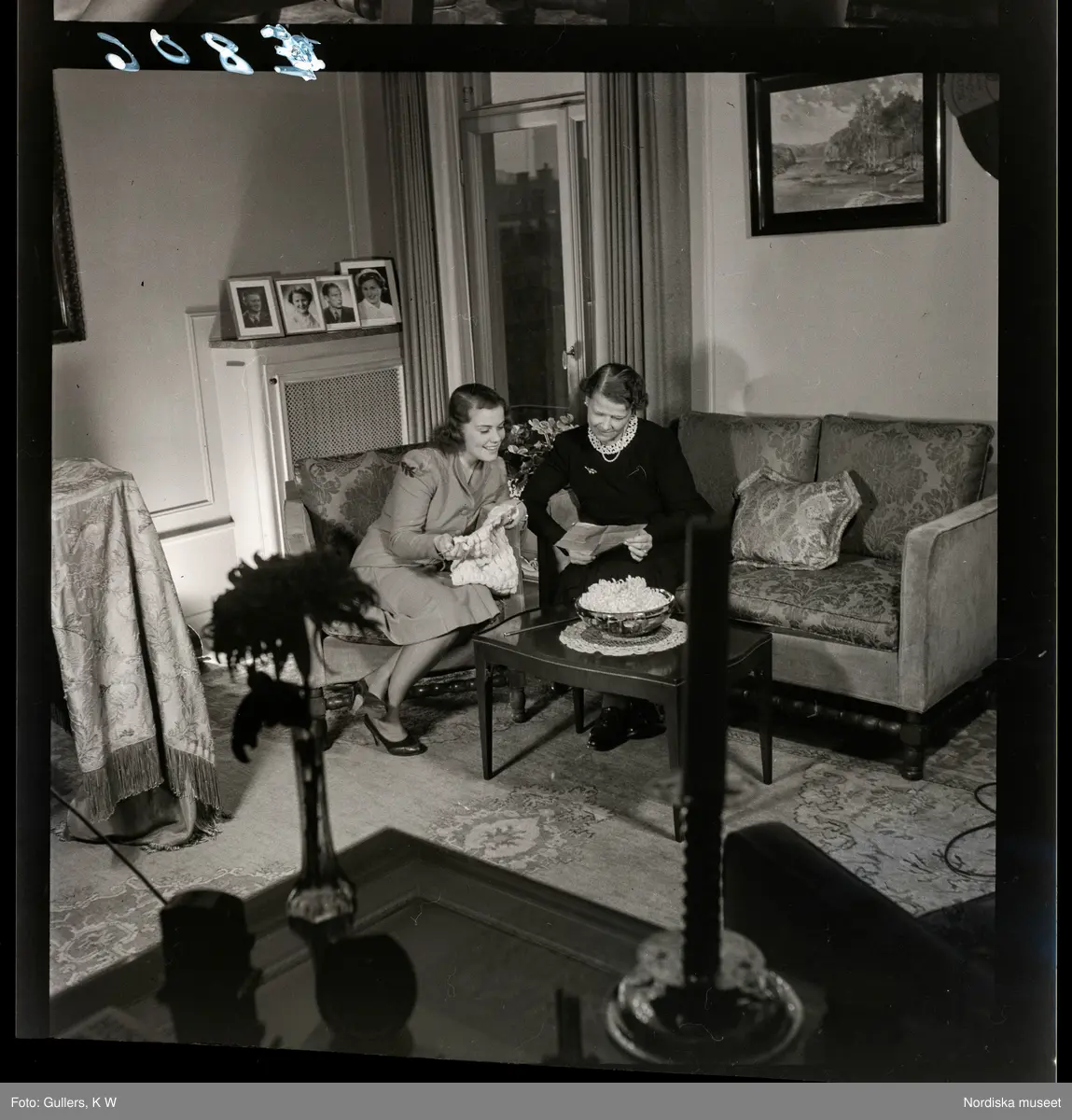 583 Sickan Carlsson för 25an Allers. Sickan Carlsson sitter och stickar, visar en kvinna (sin mor?) sin stickning.