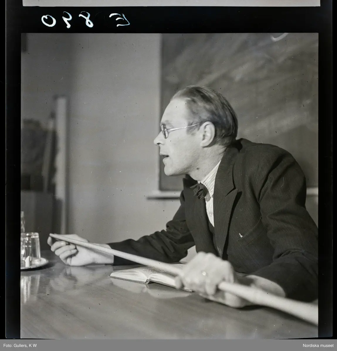 584 Brunsviks Folkhögskola. Magister vid kateder med pekpinne i händerna.