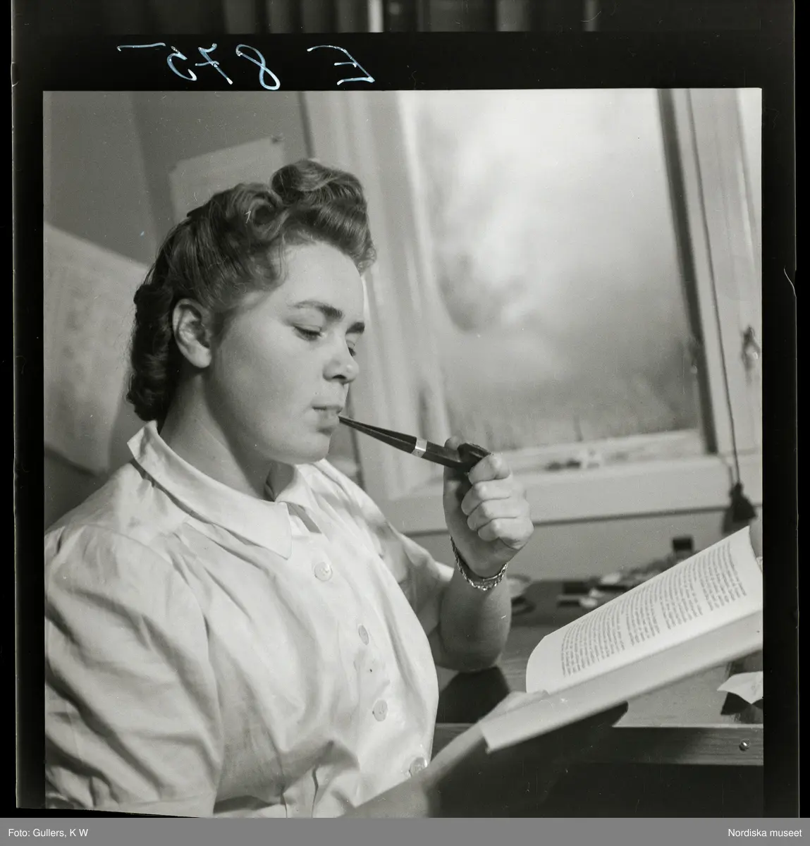 584 Brunsviks Folkhögskola. En ung kvinna sitter och läser och röker pipa.