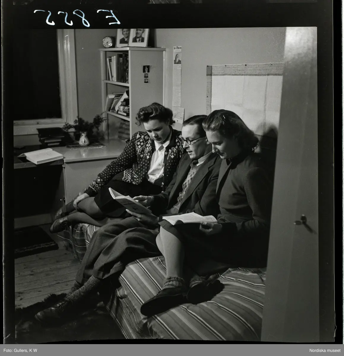 584 Brunsviks Folkhögskola. Studenter sitter på sängen i ett studentrum och läser tillsammans.