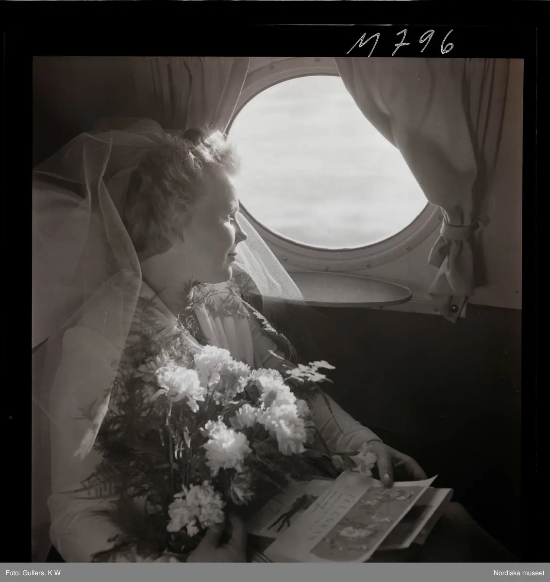 "1680 Bröllop i luften med Abas DC-4 ""Sunnan"" till Paris " En brud sitter i ett flygplan med brudbukett och telegram i famnen.