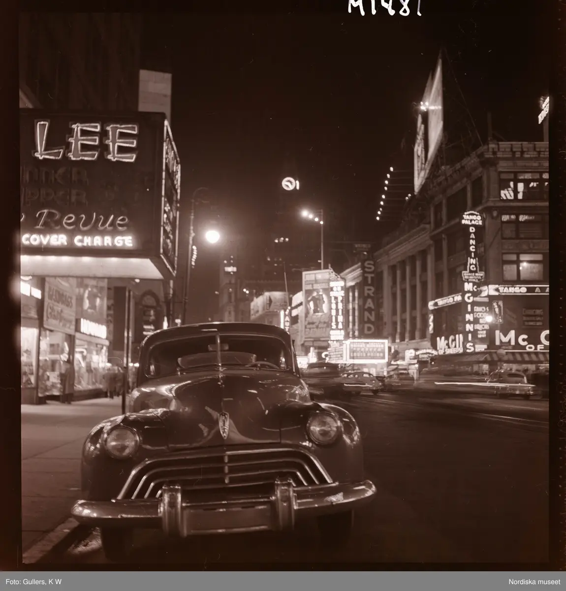 1690 New York, allmänt. Nattbild. Neonljus och trafik på gata.