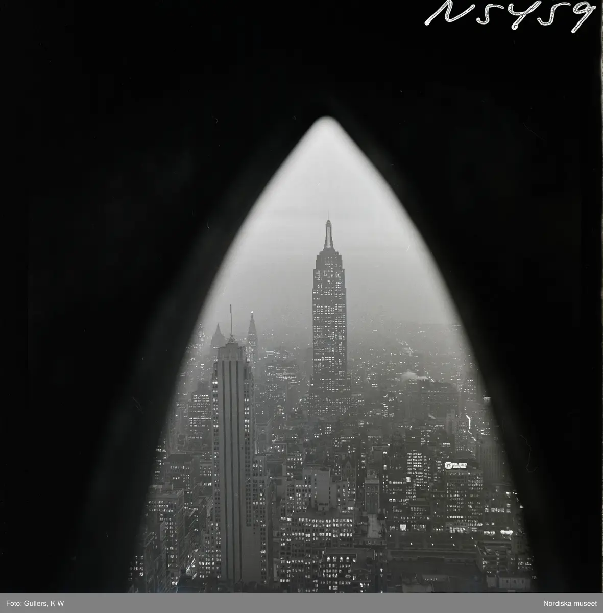 1690 New York allmänt (N.Y. Herald Tribune). Vy över stadens skyskrapor, Empire state building. Kvällsbild.