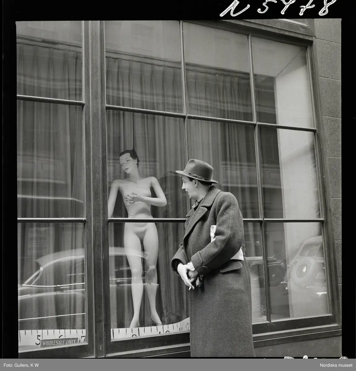1690 New York allmänt (N.Y. Herald Tribune). En man betraktar en skyltdocka i ett fönster.