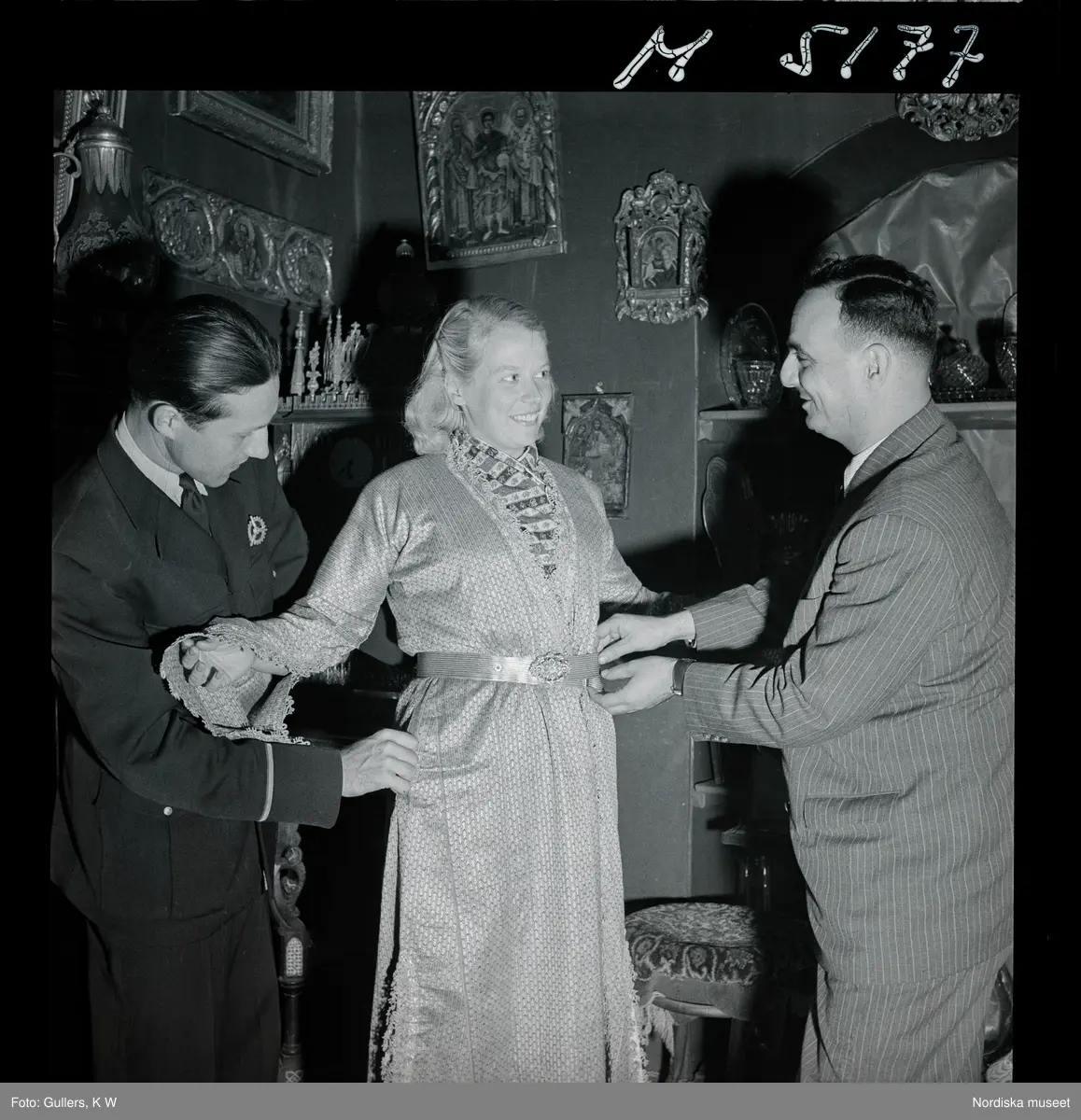 1717/K Istanbul allmänt. Två män hjälper till att klä en kvinna i en dräkt, ovanpå hennes vanliga kläder.