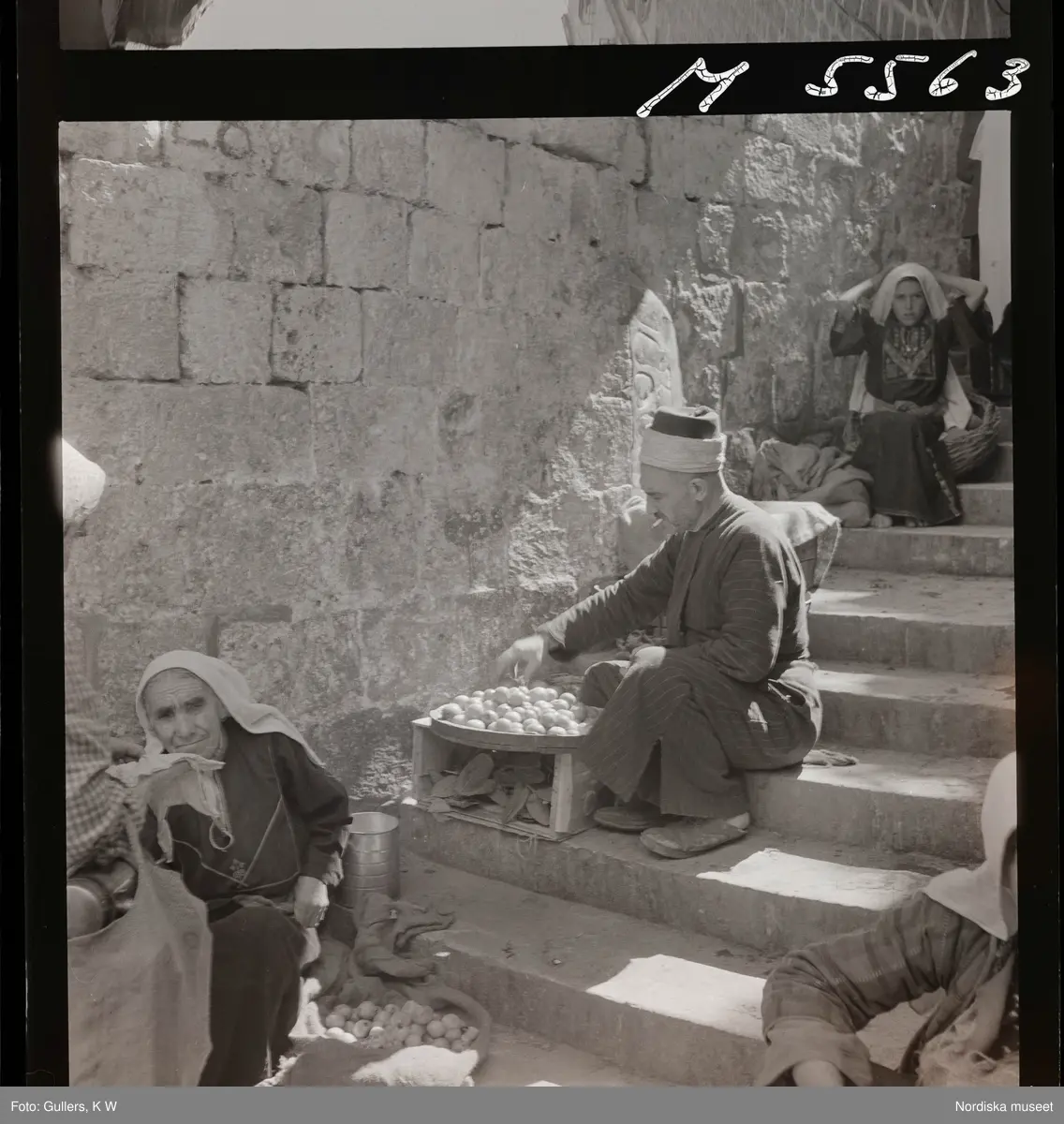 Gatuförsäljare. En man sitter i en trappa med ett fat frukt.