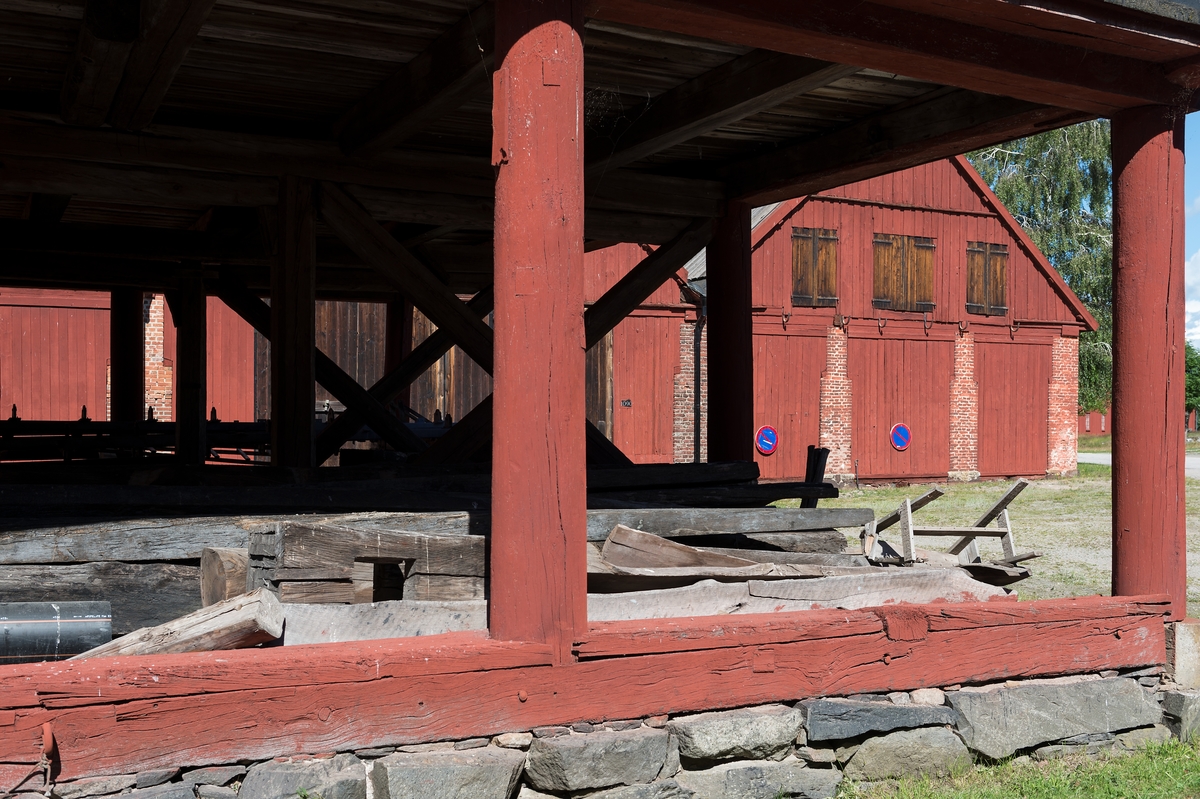 Fotodokumentation av byggnader på Lindholmen i Karlskrona. I bakgrunden: Skjul för förvaring av ekvirke. Skjul 13, 14, 15. Dessa ritades av överstelöjtnant-mekanikus Jonas Lindströmer. Byggnaderna uppfördes omkring sekelskiftet 1800. I förgrunden: Slitaget byggdes omkring 1850 användes som ett virkesskjul. De runda träpelare ska ha varit utrangerade mastträn. Byggnaden är ca: 96 meter.